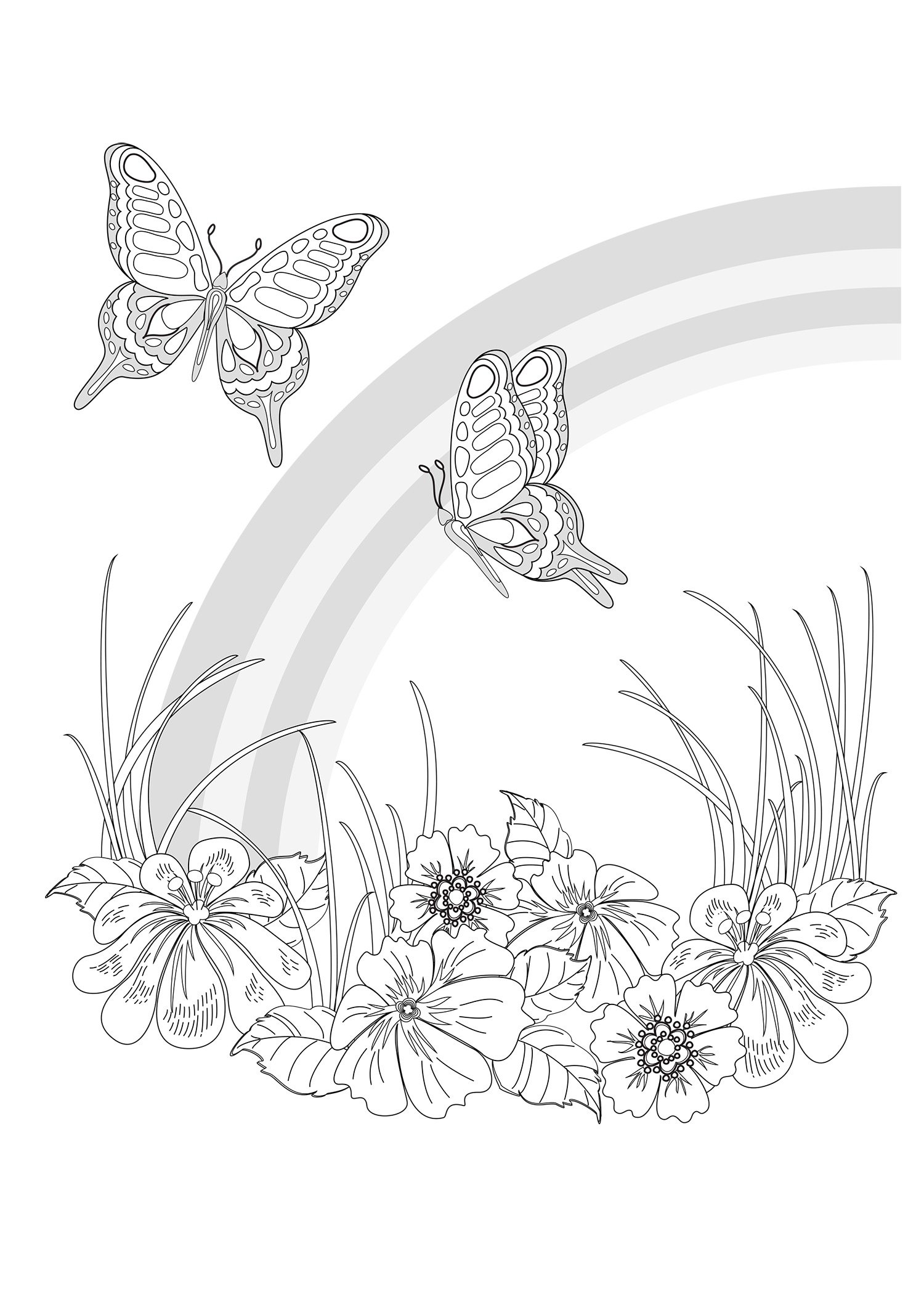 ![Раскраска луг с цветами и бабочками]()