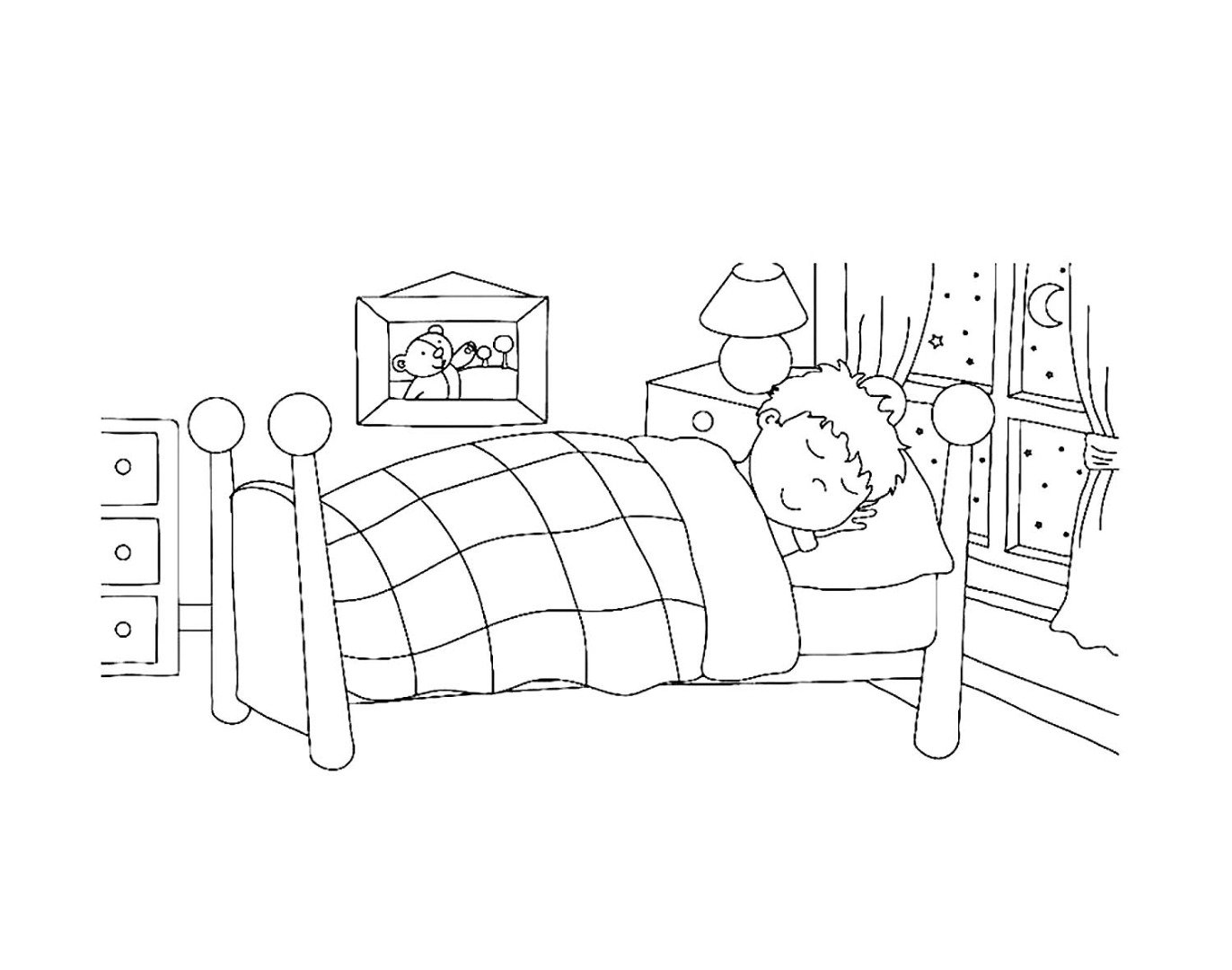 ![Раскраска девочка спит в кроватке]()