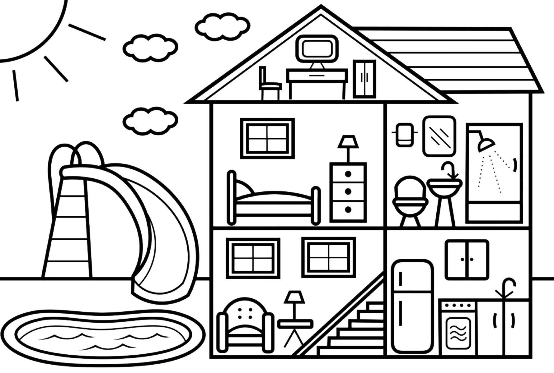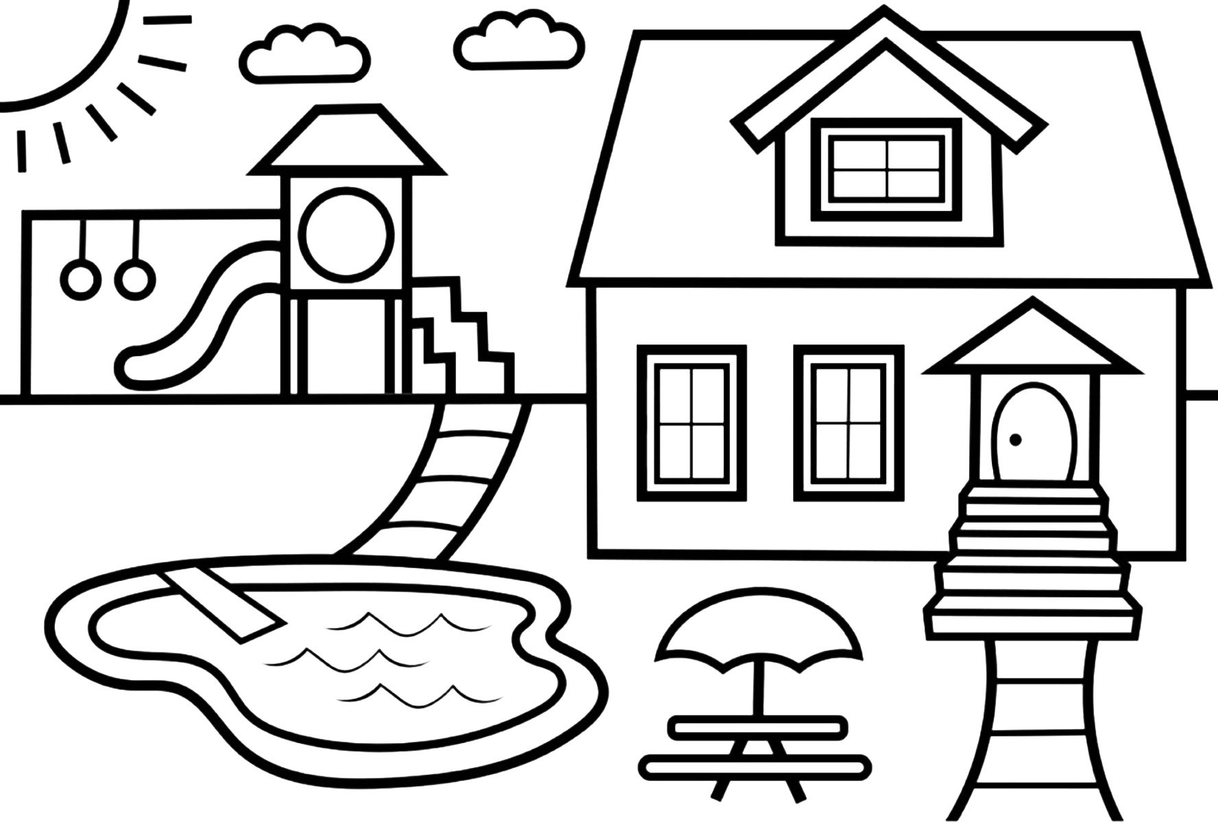 ![Раскраска домик с бассейном]()