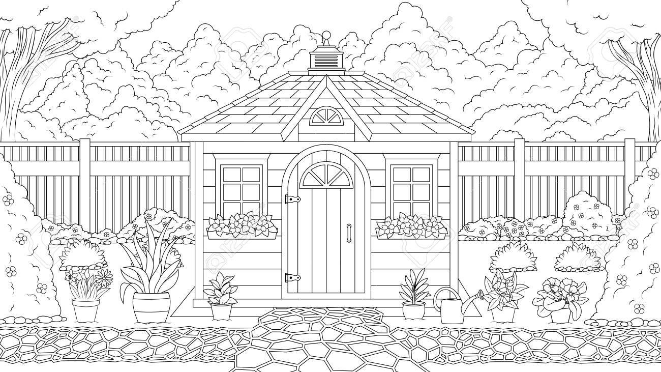 Раскраска домик с садом