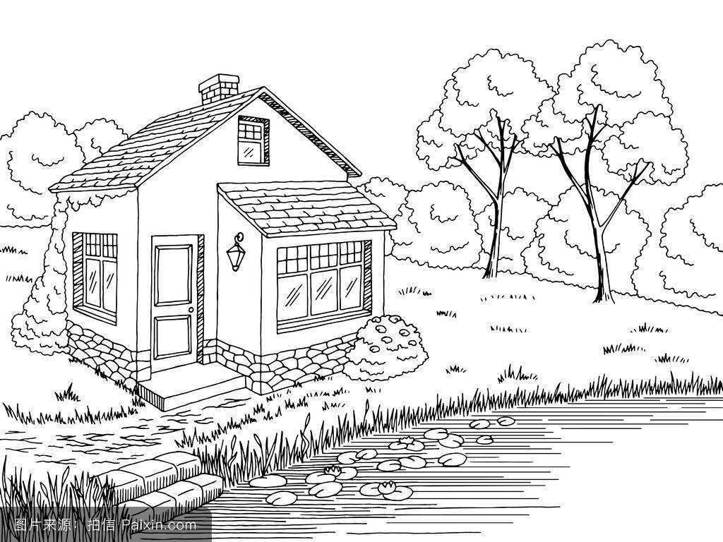 ![Раскраска домик у речки]()