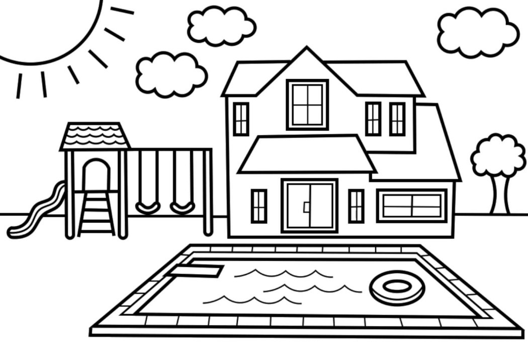 ![Раскраска домик с бассейном]()