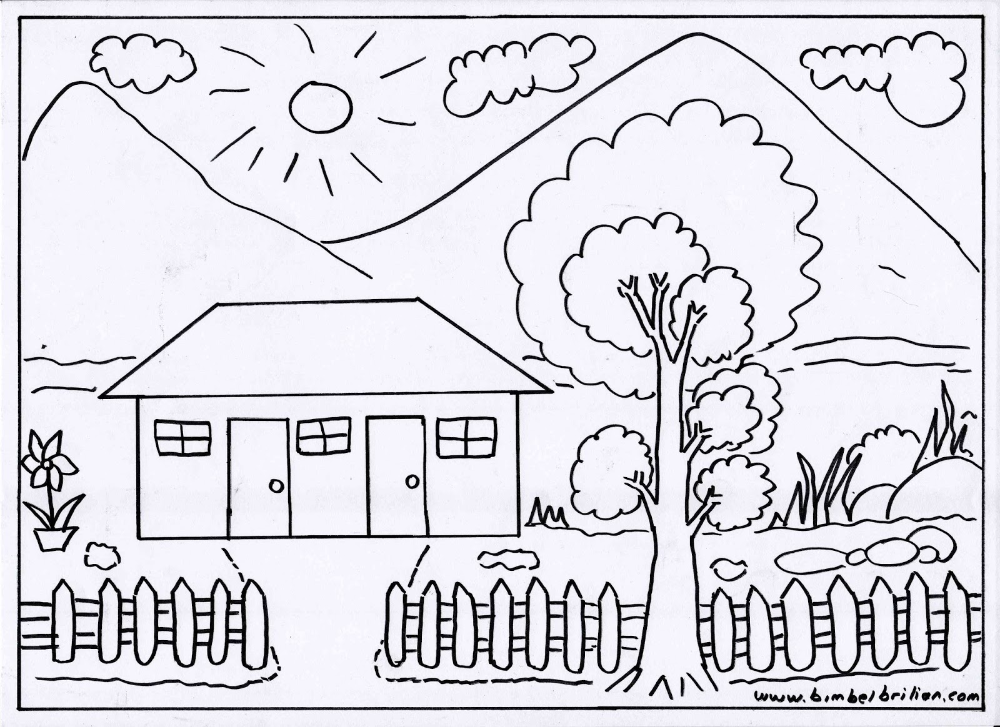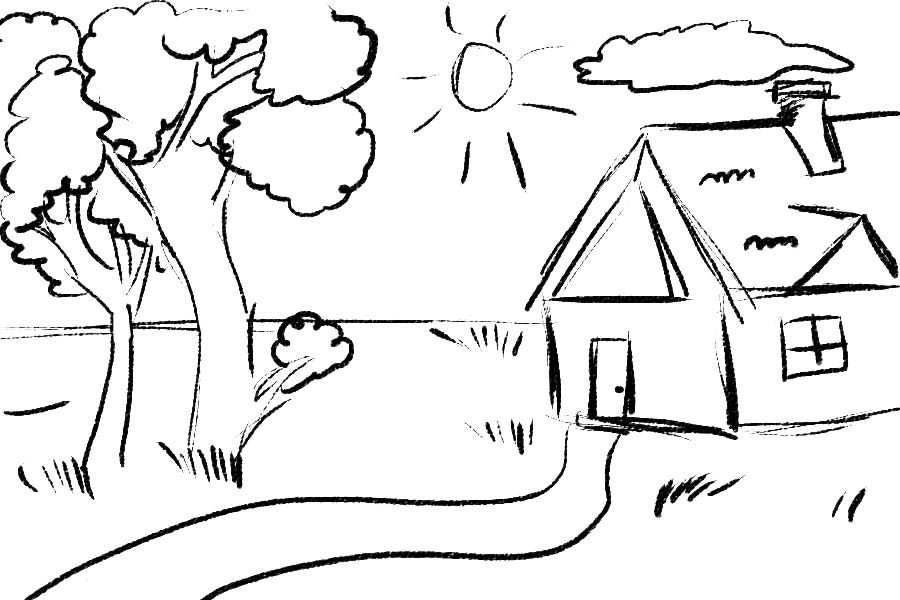 ![Пейзаж с домом раскраска]()