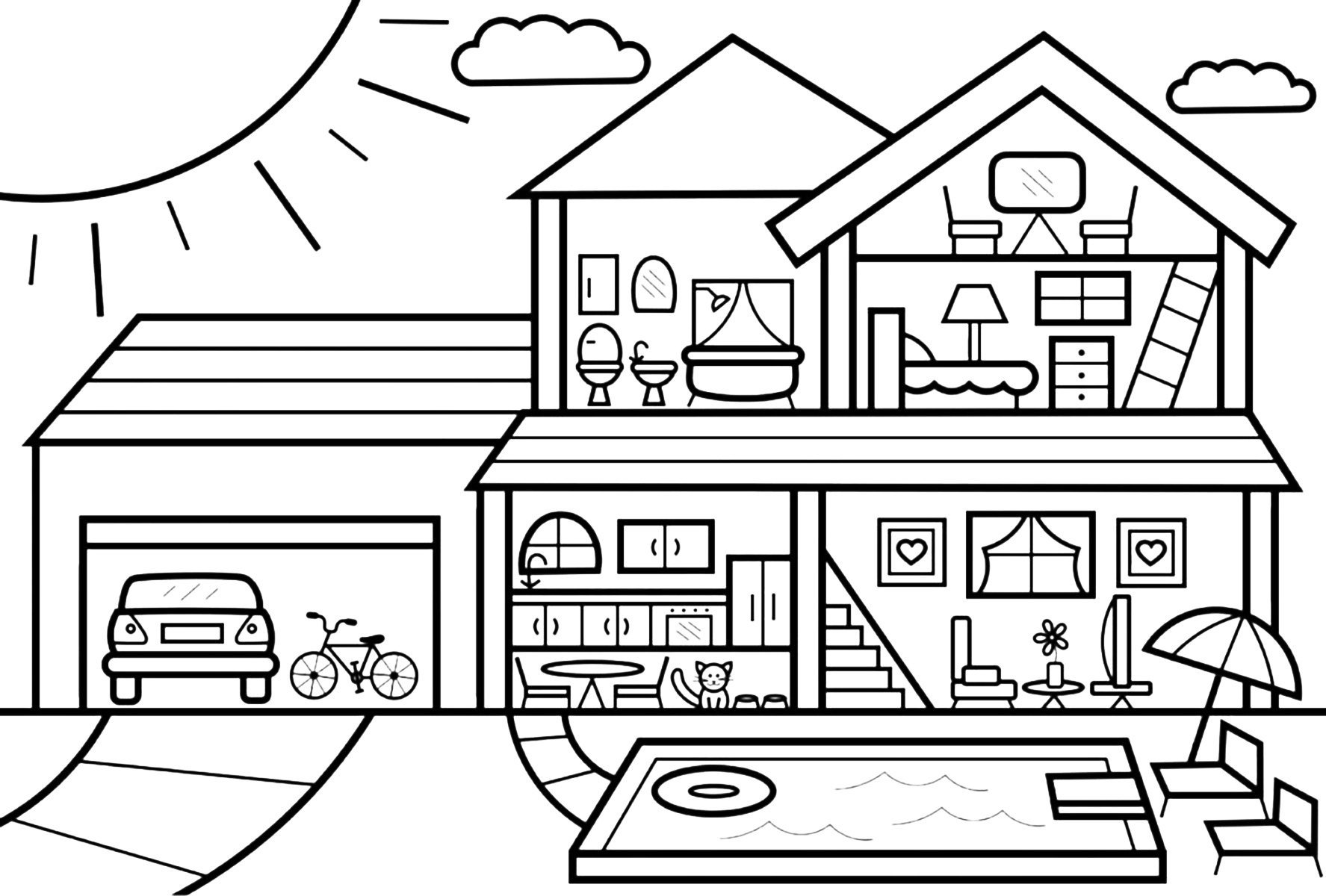 Раскраска домик с бассейном
