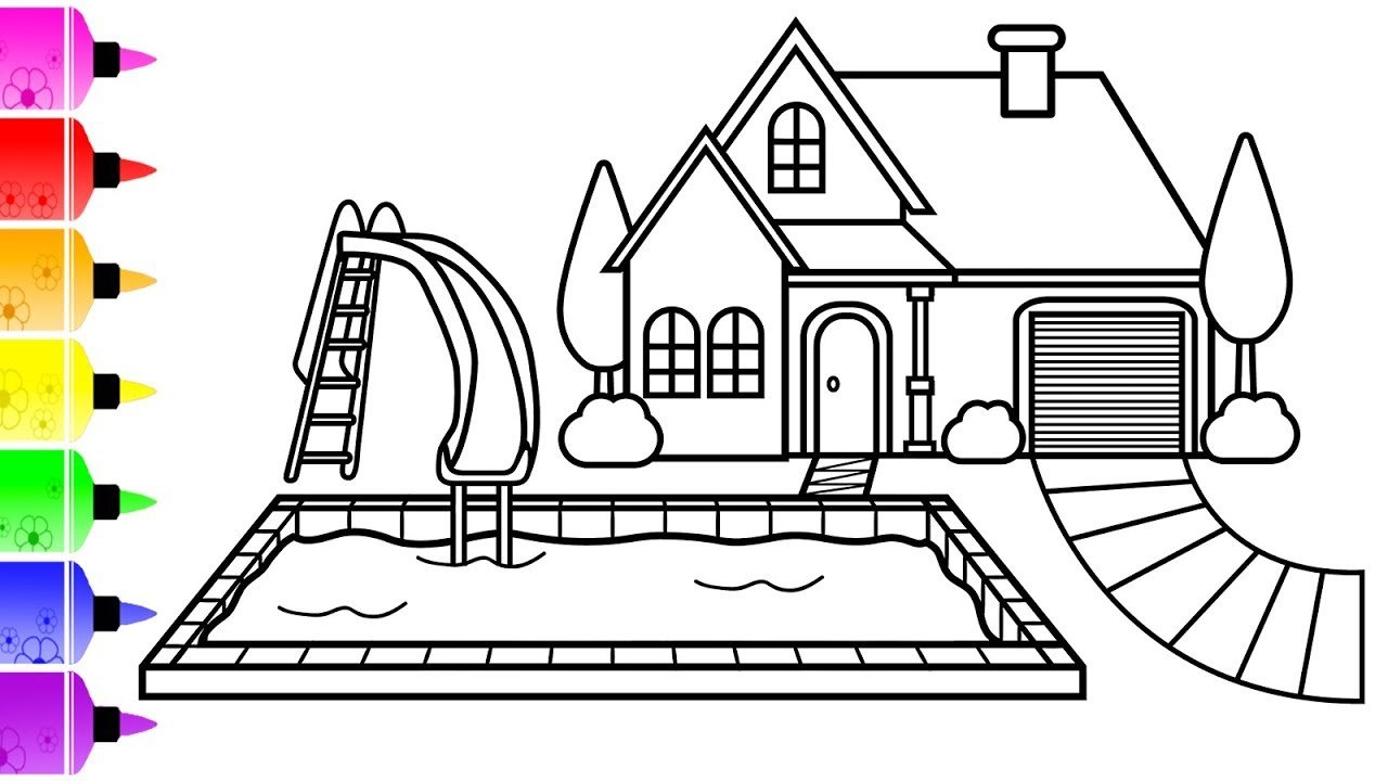 ![Раскраска дом с бассейном]()