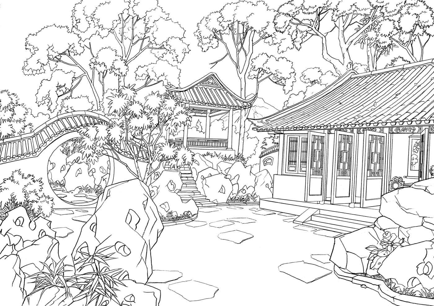 ![Китайский пейзаж раскраска]()