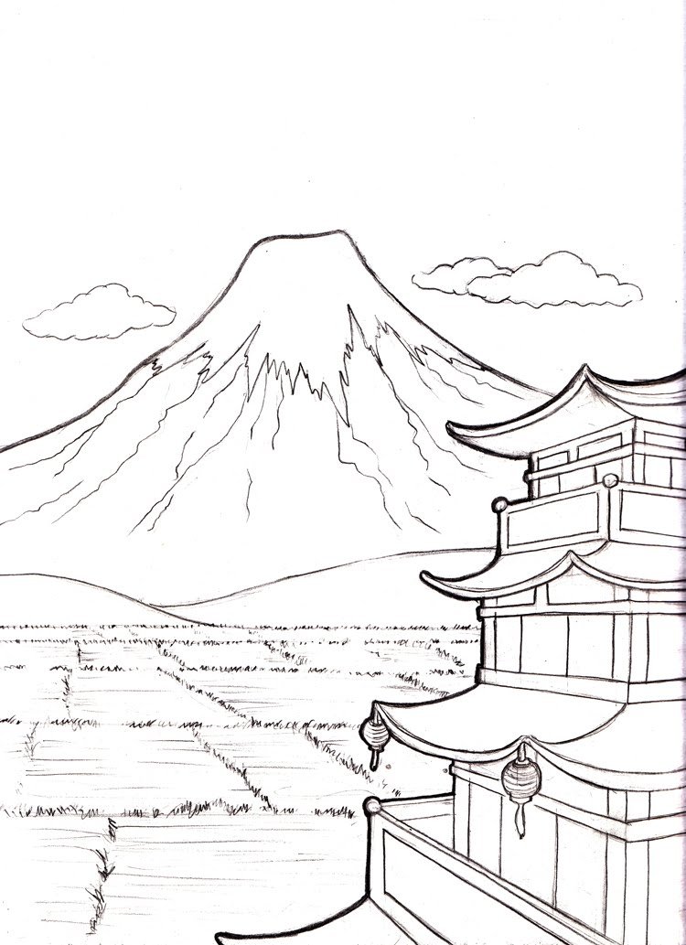 ![Японский пейзаж раскраска]()