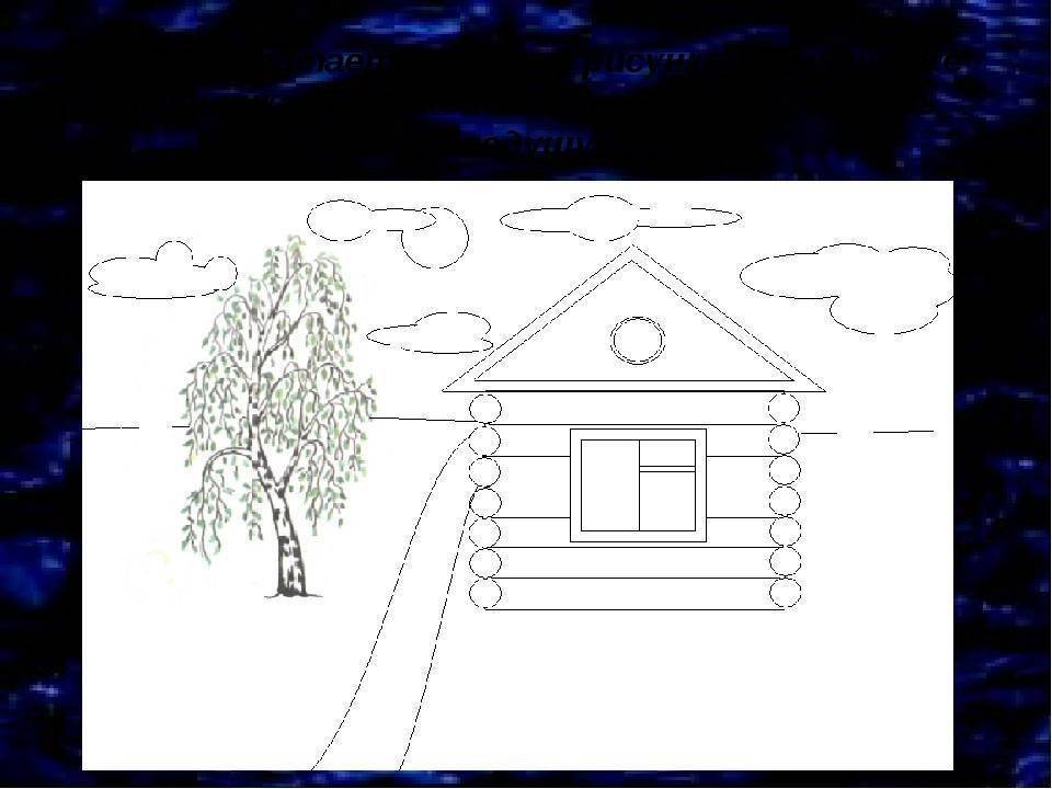 ![Поэтапное рисование избушки]()