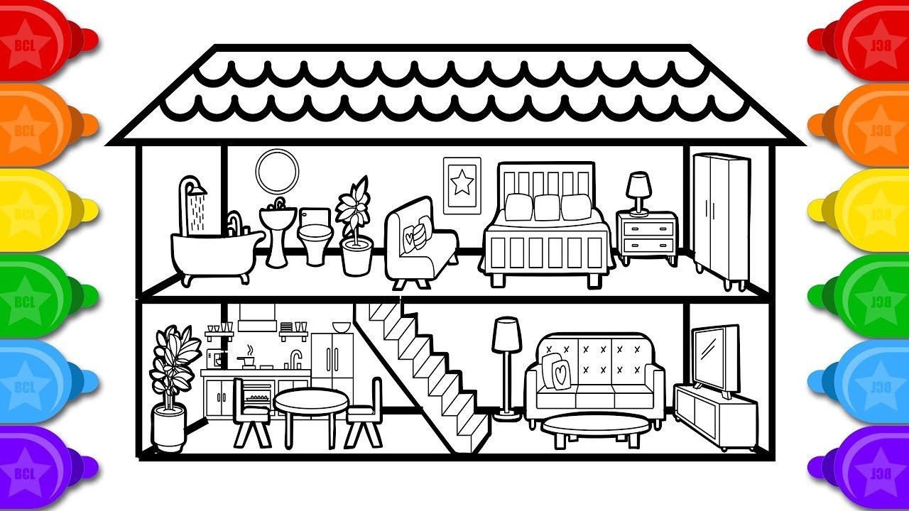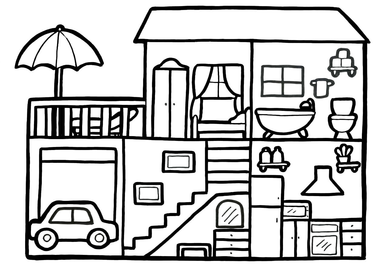 ![Дом с комнатами раскраска для детей]()