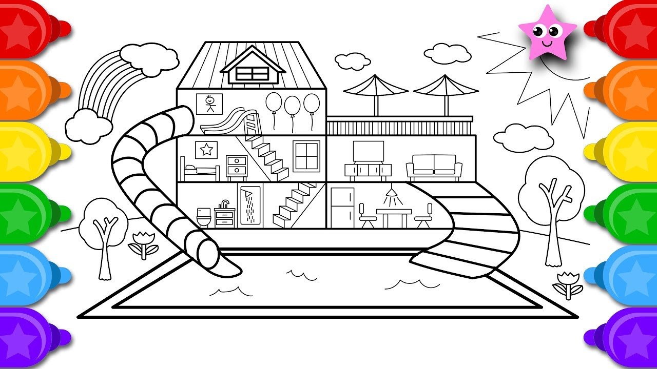 ![Раскрашивать домик с бассейном]()