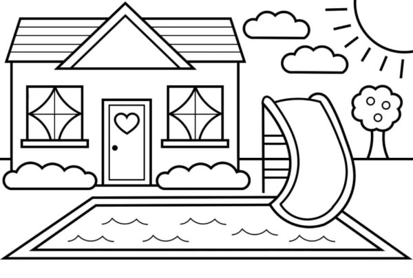 ![Раскраска домик с бассейном]()