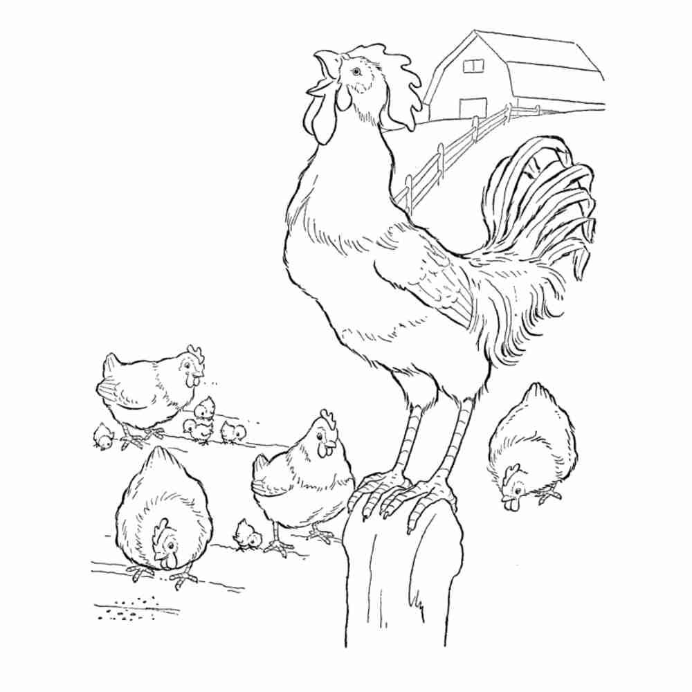 Курица петух цыплята раскраска