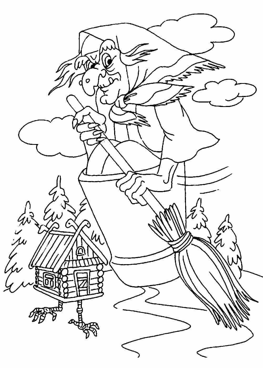 Раскраска баба Яга и избушка на курьих ножках