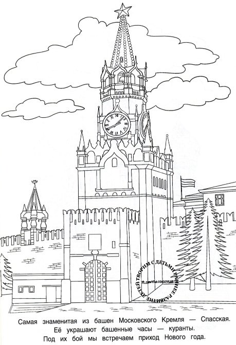 ![Спасская башня Московского Кремля для раскрашивания детям]()