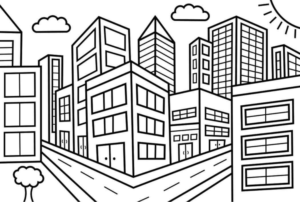 ![Городской пейзаж раскраска]()