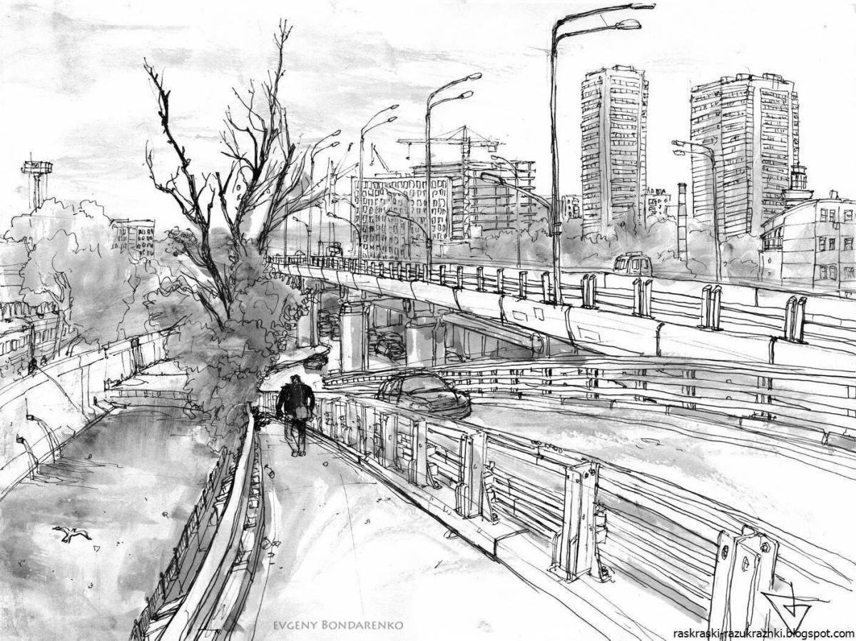 ![Современный городской пейзаж карандашом]()