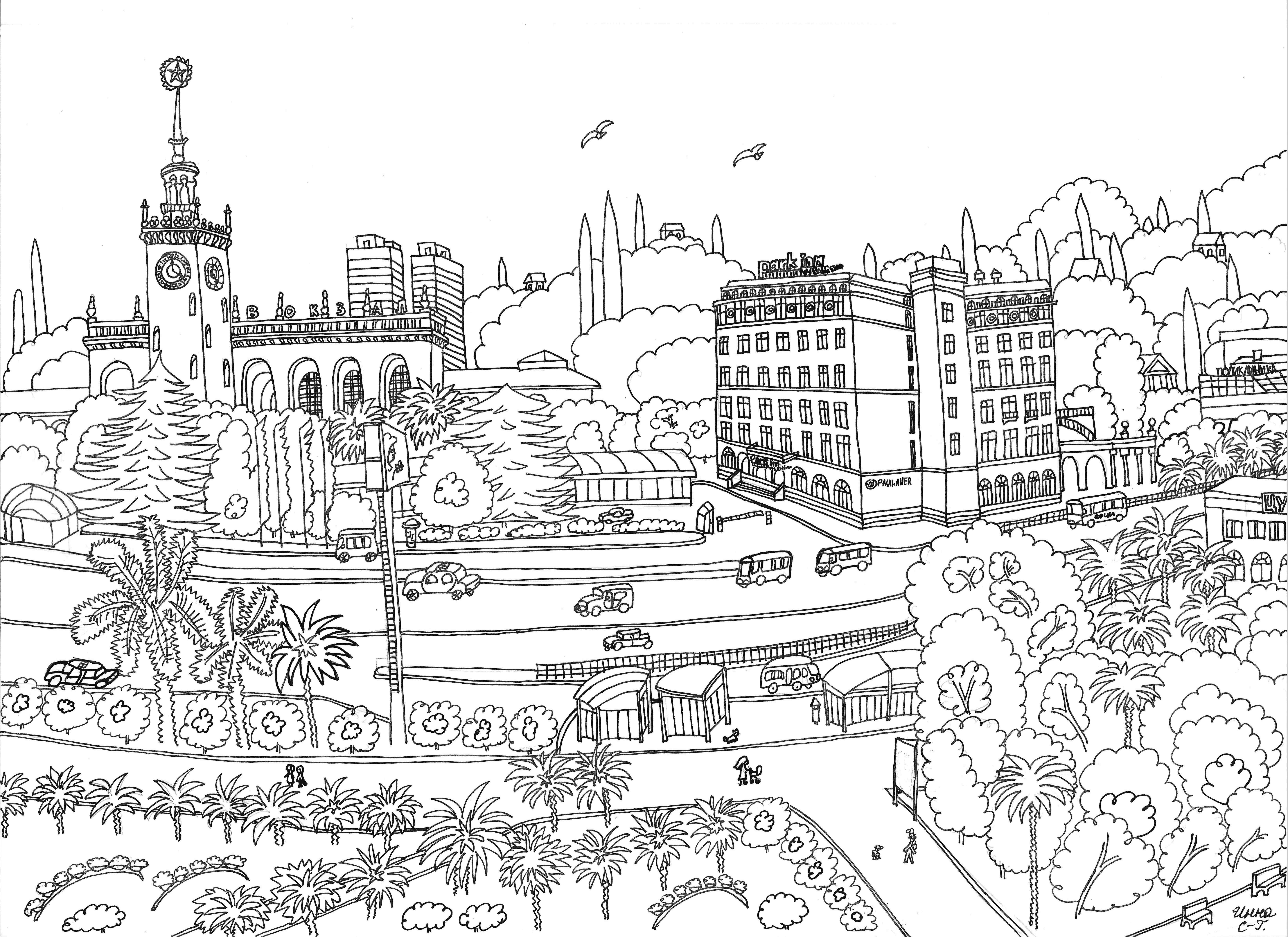 ![Городской пейзаж раскраска]()