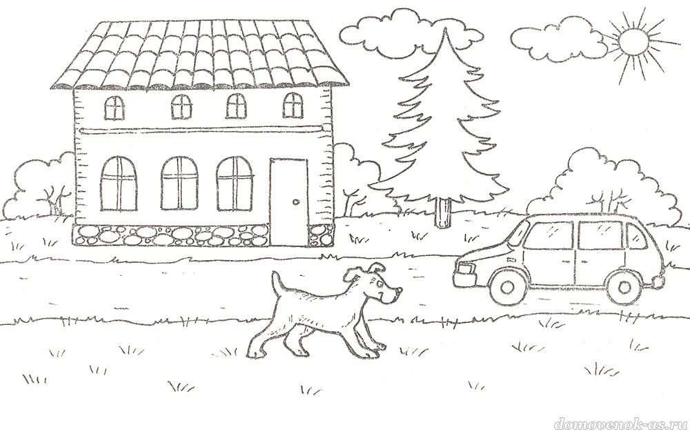 ![Раскраска домик с машинкой]()