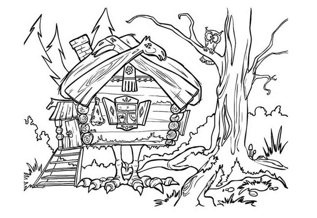 ![Раскраска баба Яга и избушка на курьих ножках]()