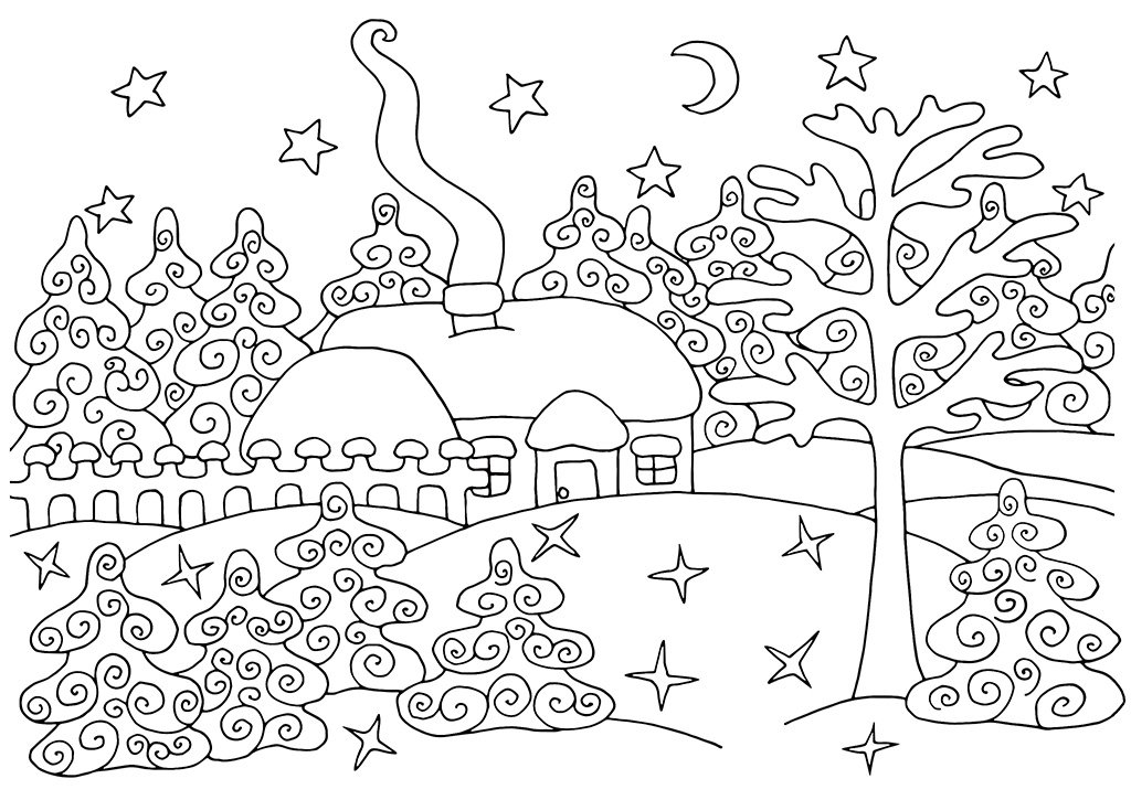 ![Зимний пейзаж раскраска]()