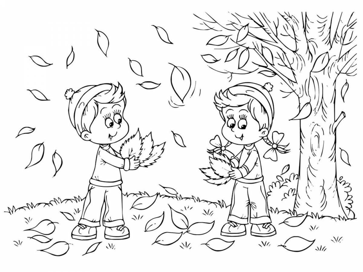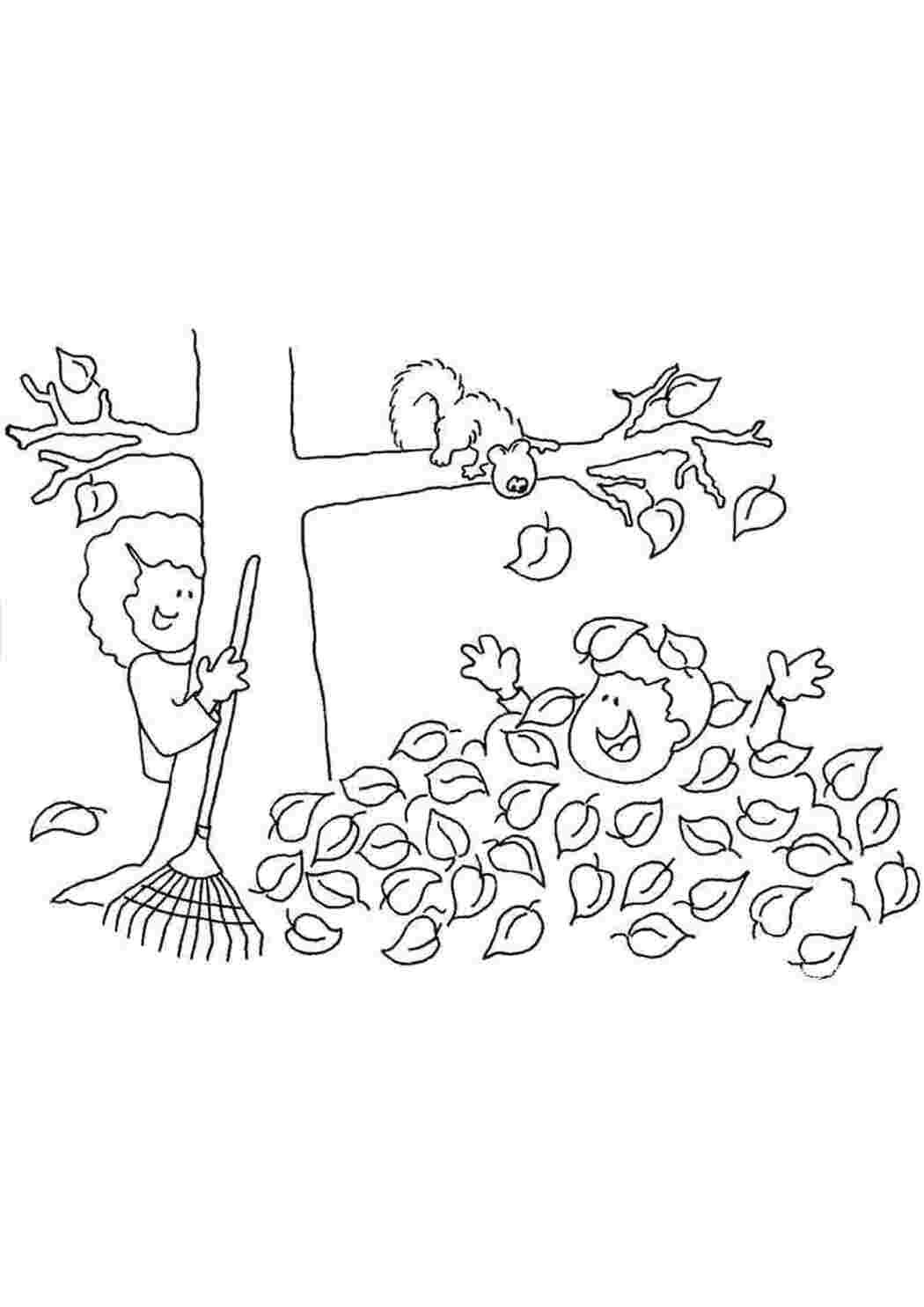 ![Раскраска дети сгребают листья]()