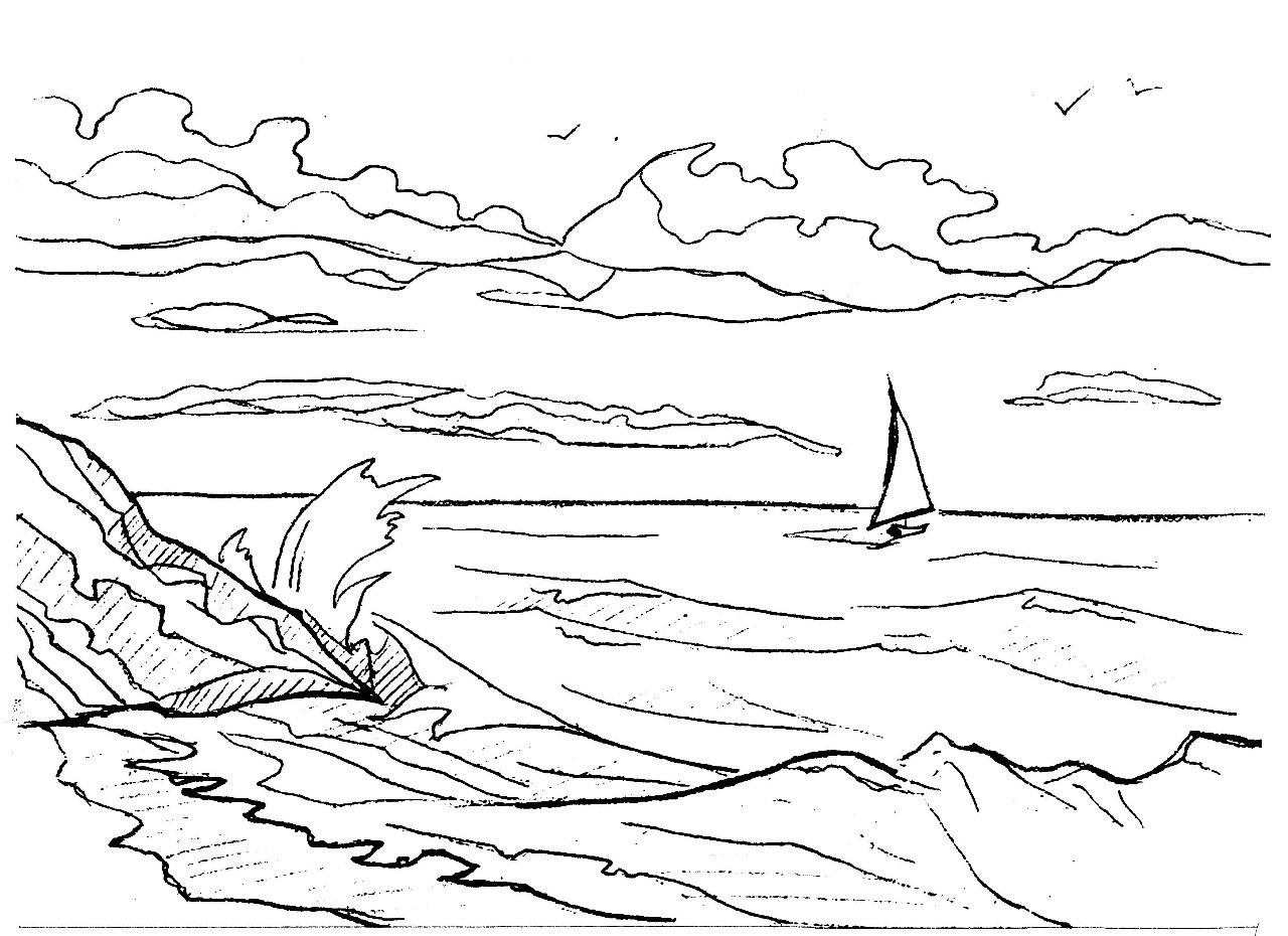 ![Морской пейзаж раскраска]()