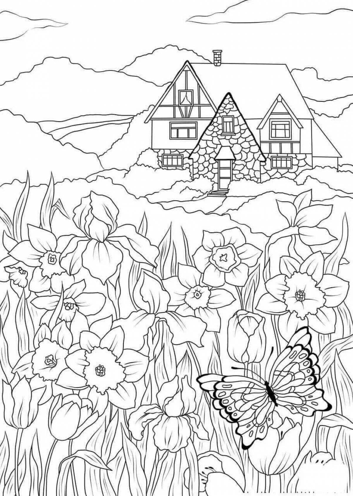 Домик и природа для раскрашивания для детей