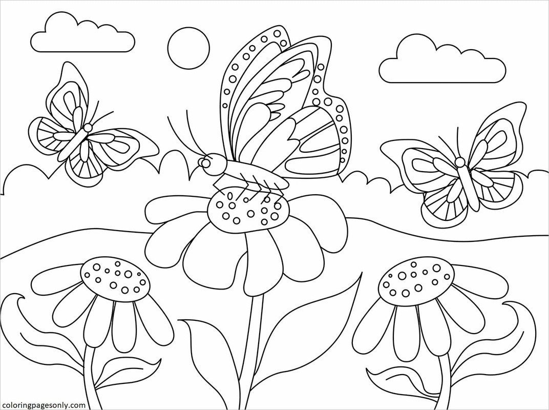 Раскраски пейзаж с бабочками