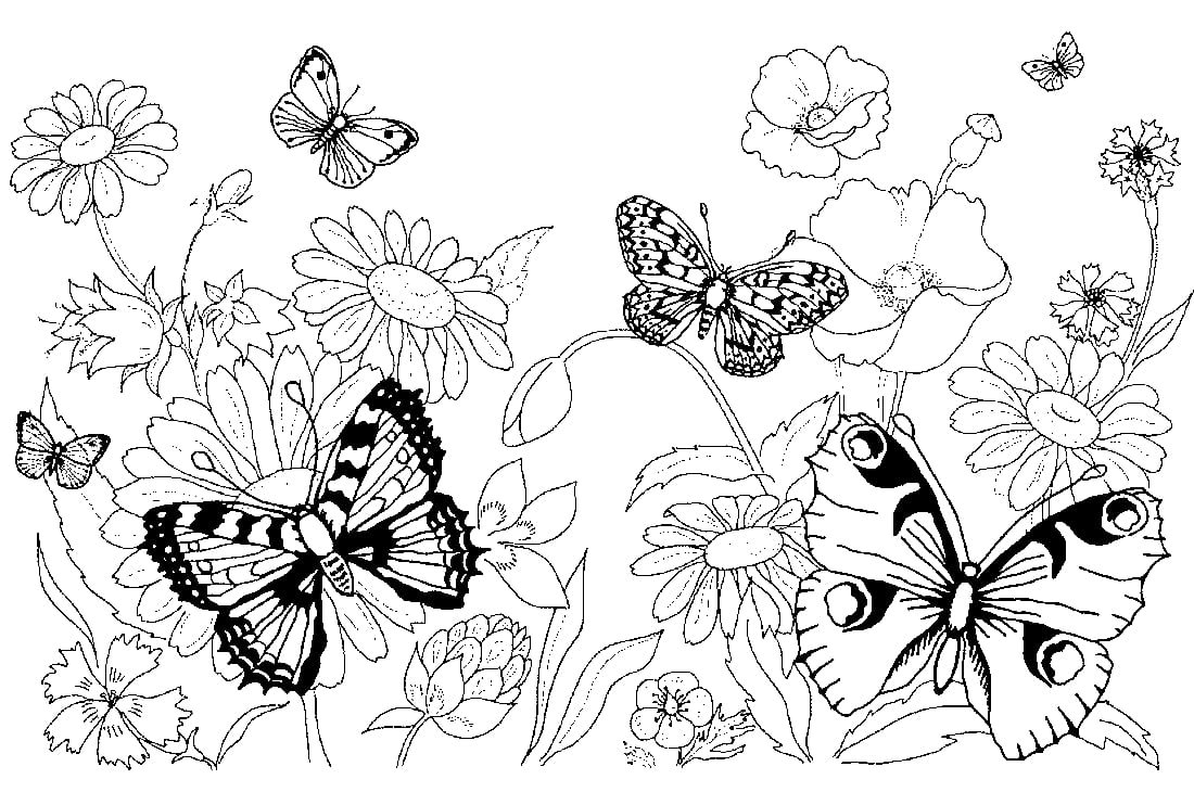 Раскраска Цветочная Поляна с бабочками