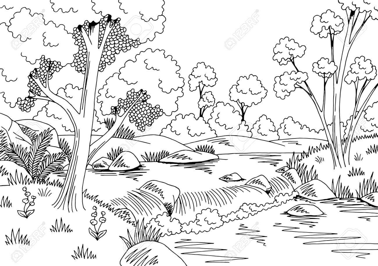 ![Лес и речка раскраска]()