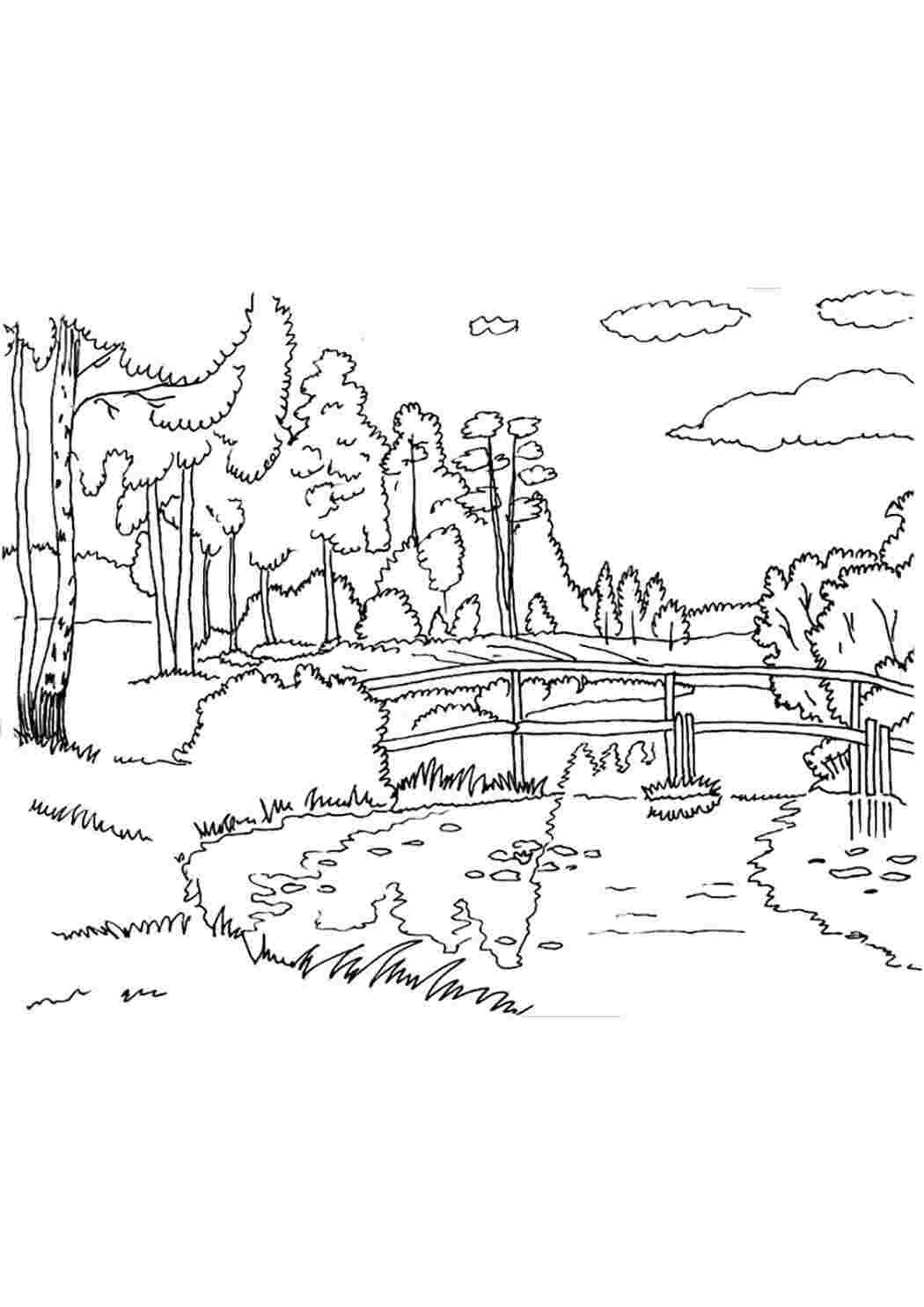 Лес и речка раскраска