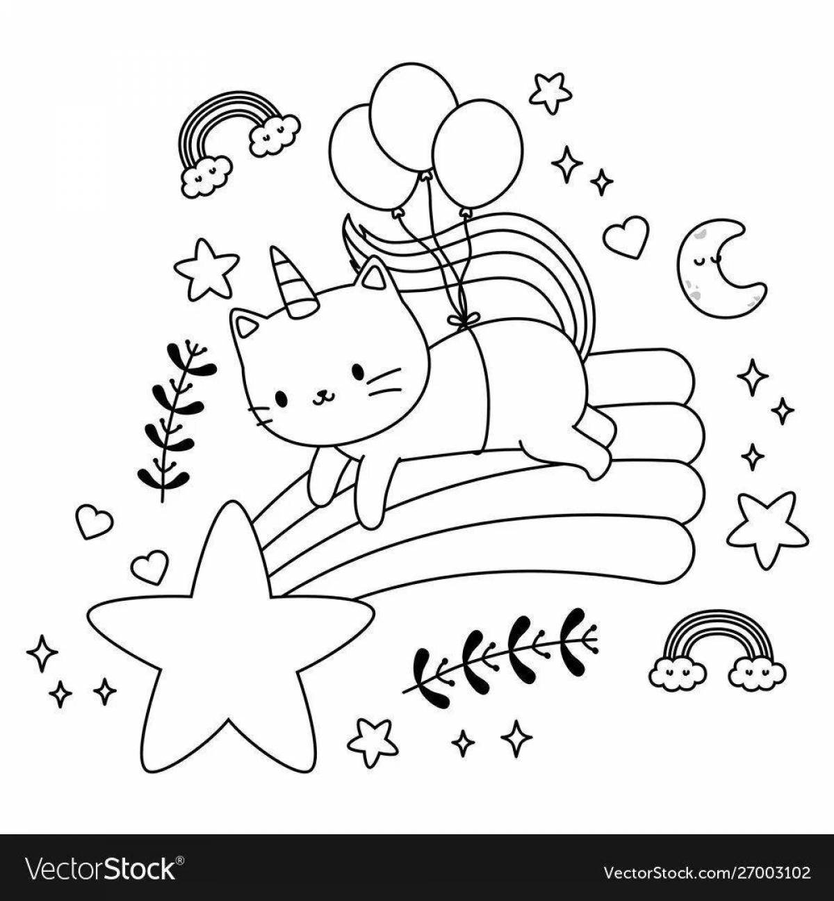 Котик с радугой раскраска