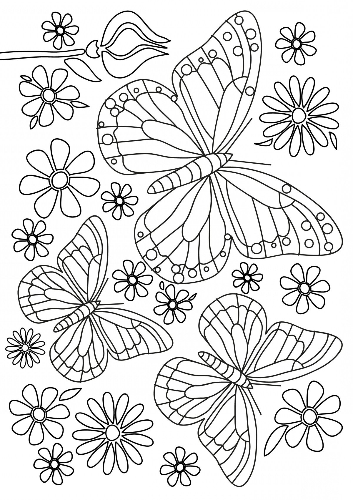 ![Раскраска луг с цветами и бабочками]()