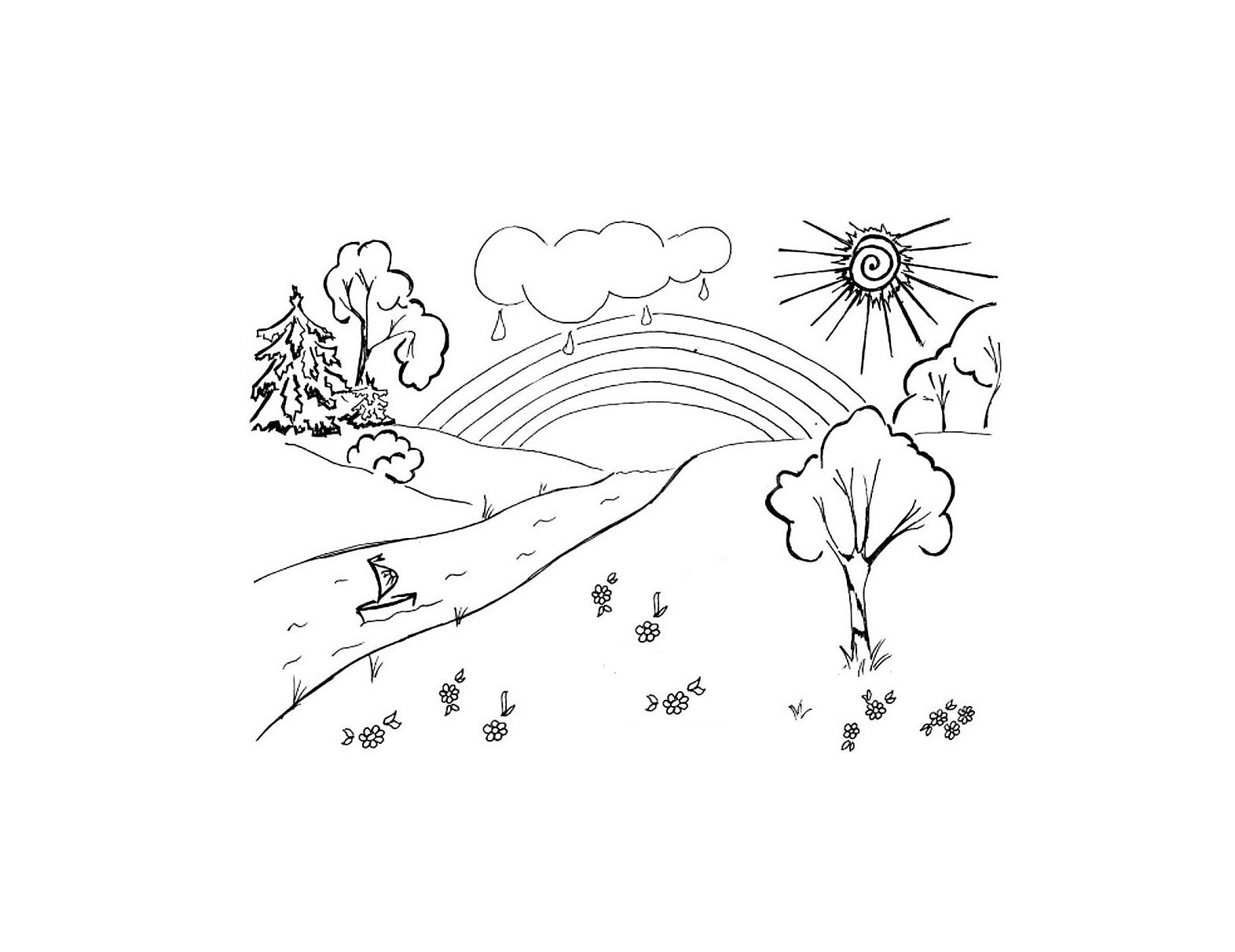 ![Пейзаж с радугой раскраска для детей]()