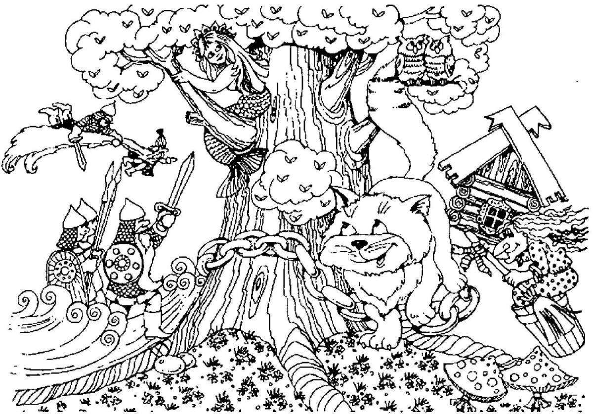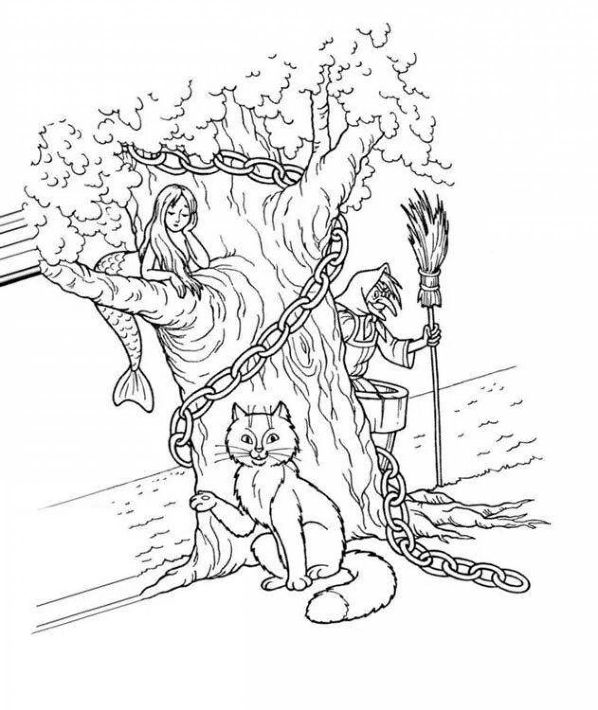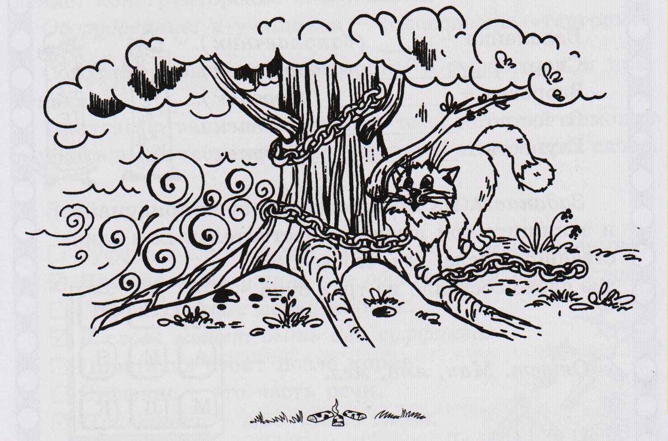 ![Раскраска сказки Пушкина у Лукоморья дуб зеленый]()