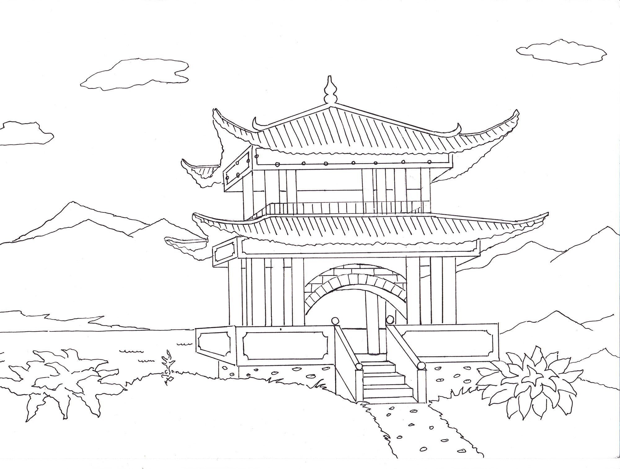 ![Китайский пейзаж раскраска]()