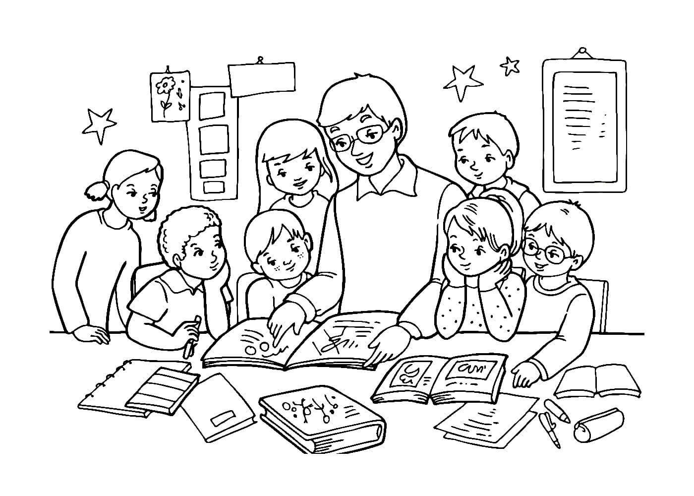 Раскраска школа учитель и дети для детей