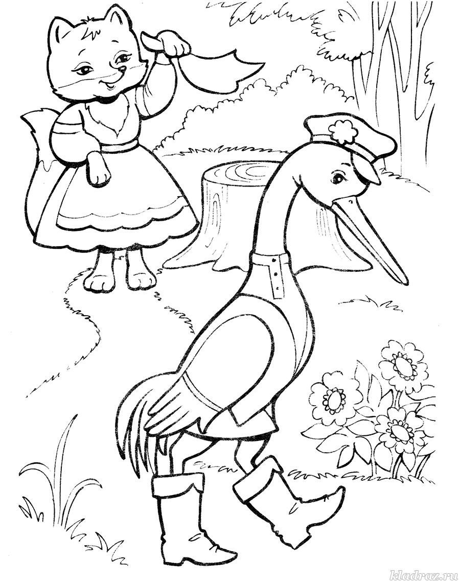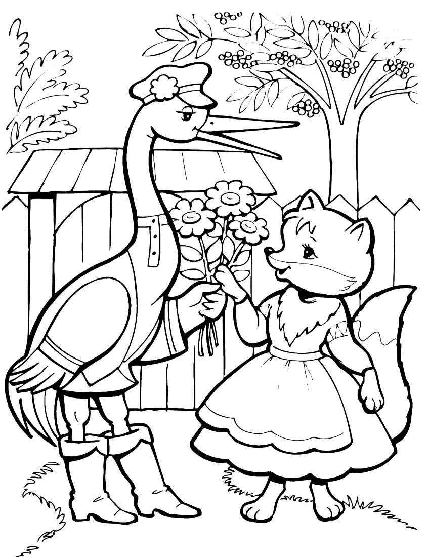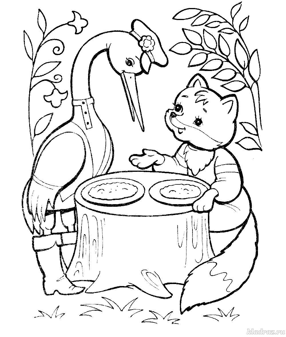 ![Раскраски для детей лиса и журавль русские народные сказки]()
