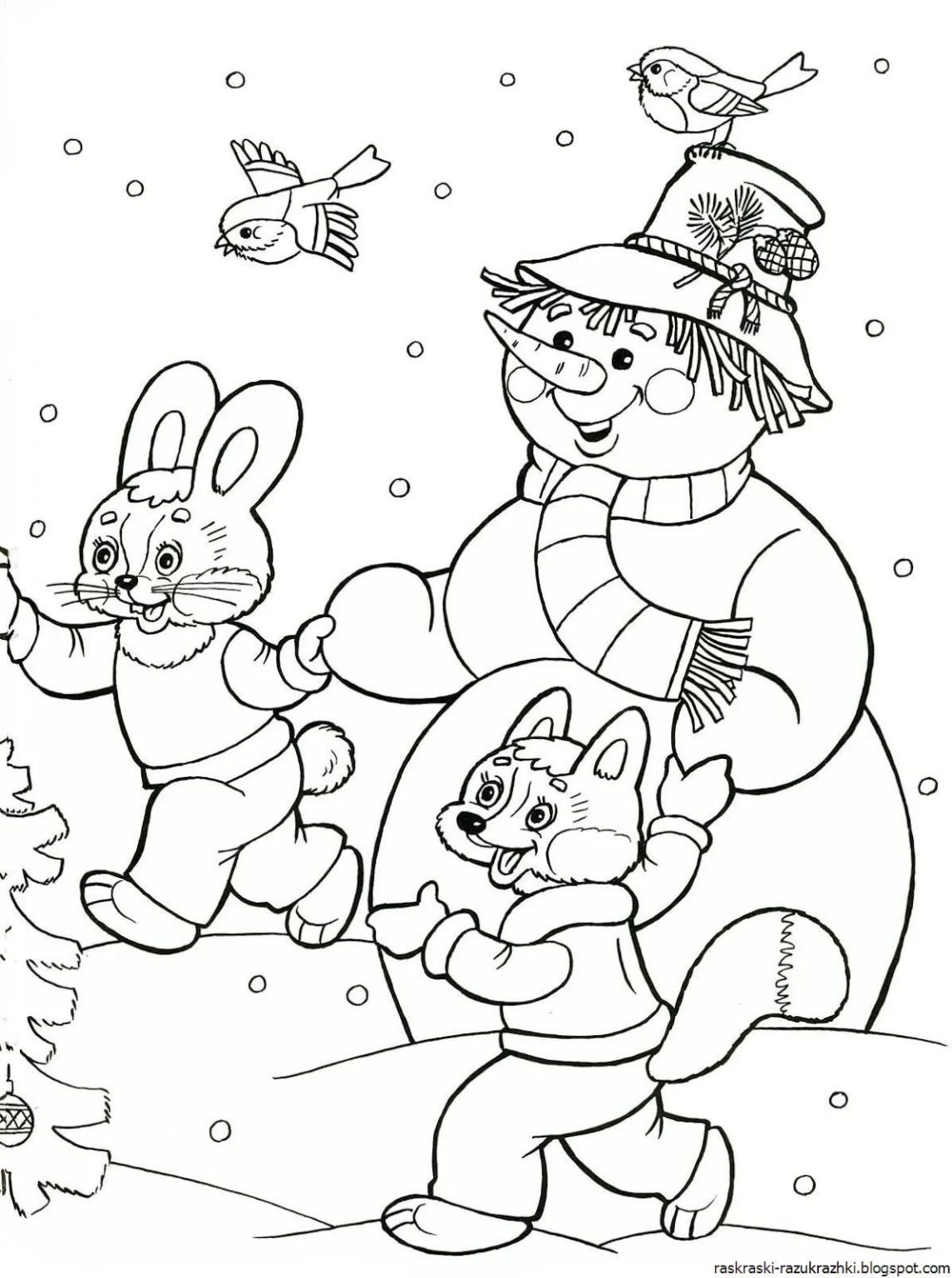 ![Снеговик с елкой раскраска]()