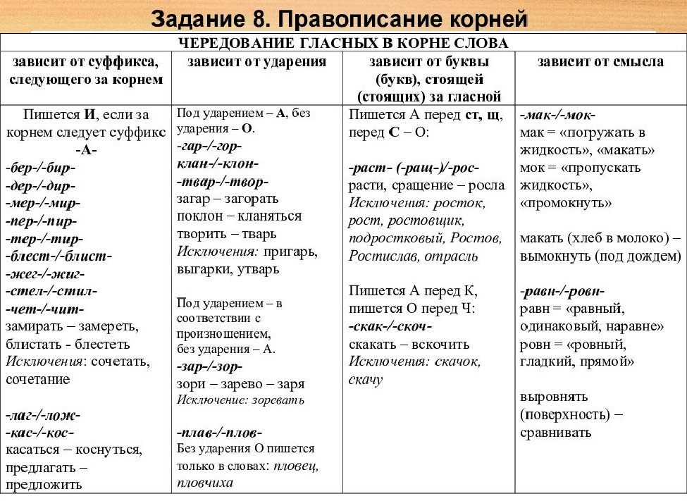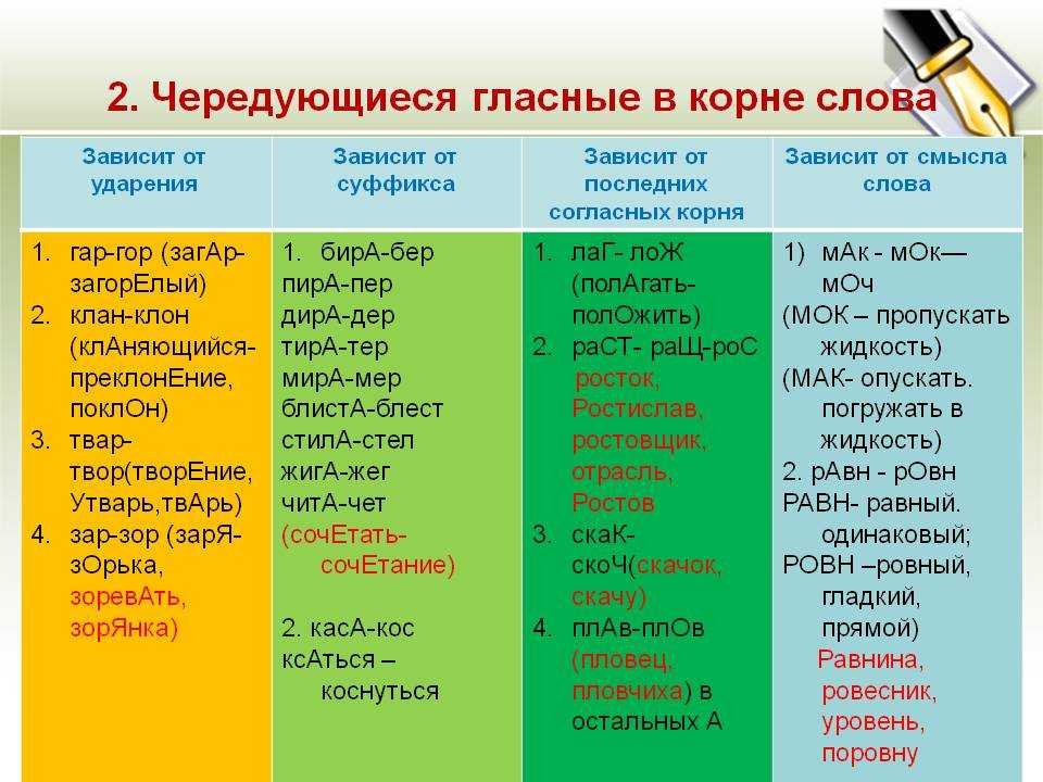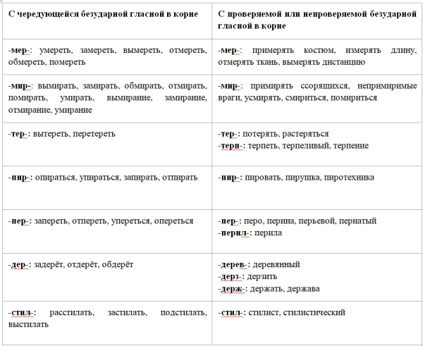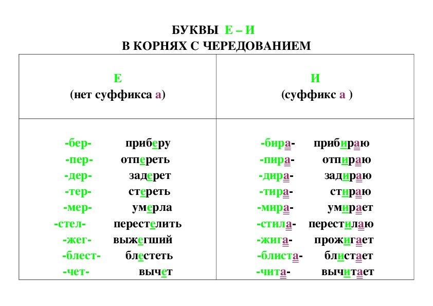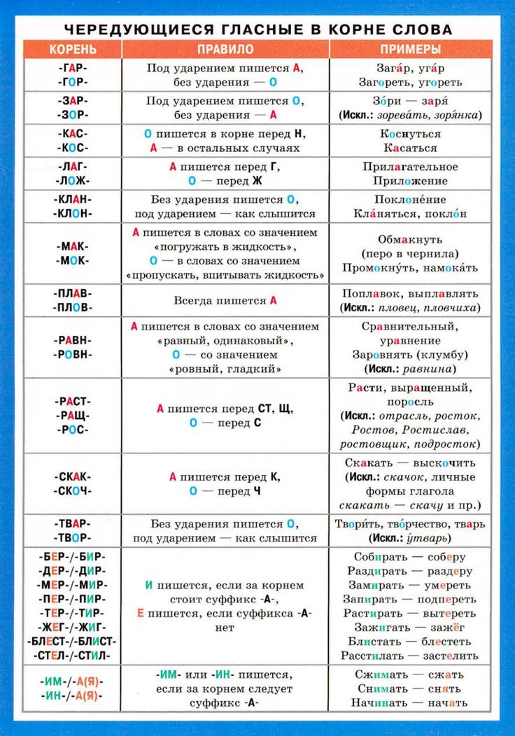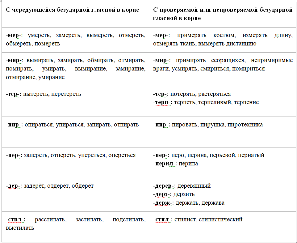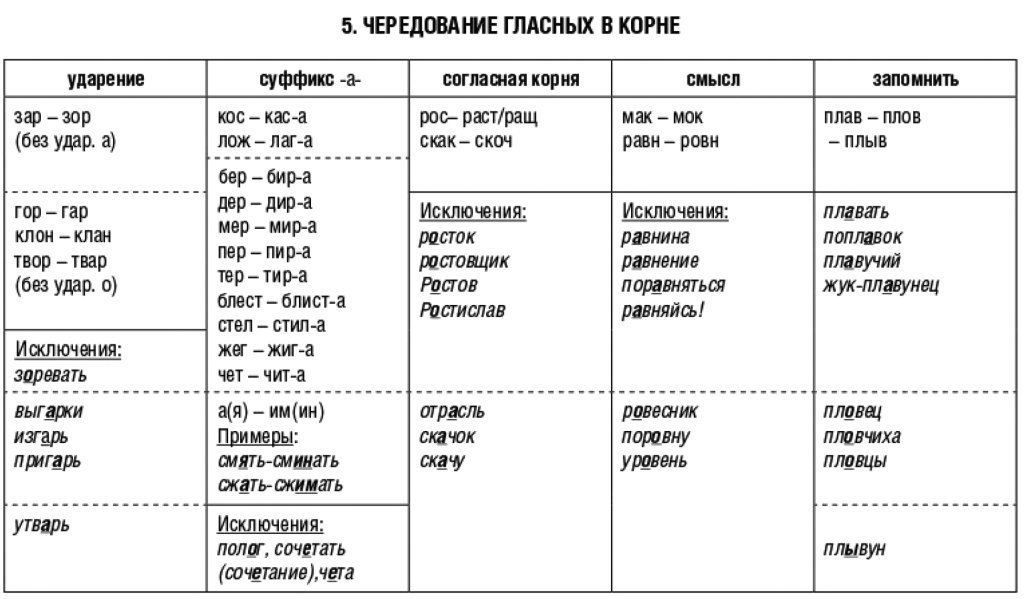 Чередующиеся гласные корня таблица