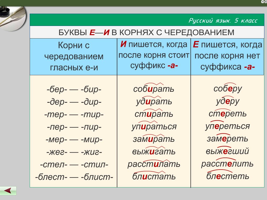 Корни с чередованием е и 5 класс правило