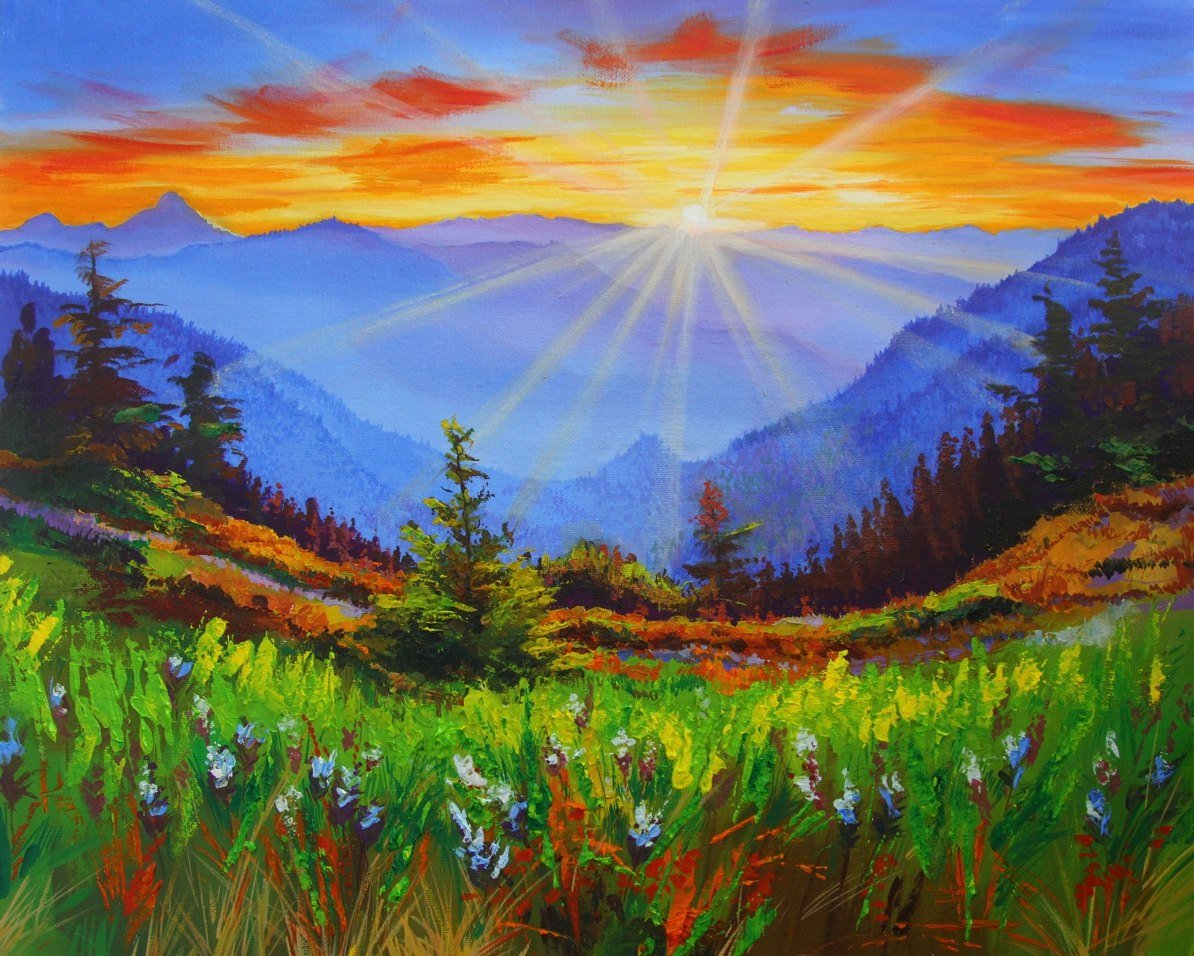 Пейзаж с солнцем живопись