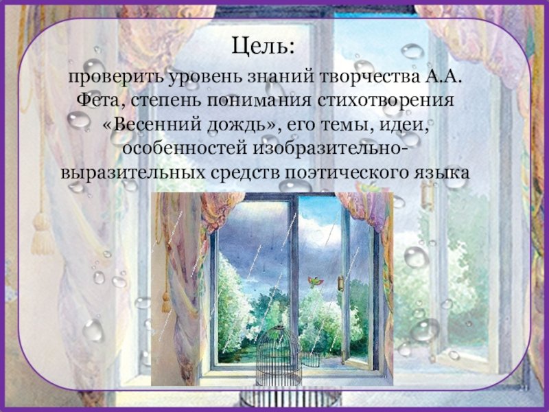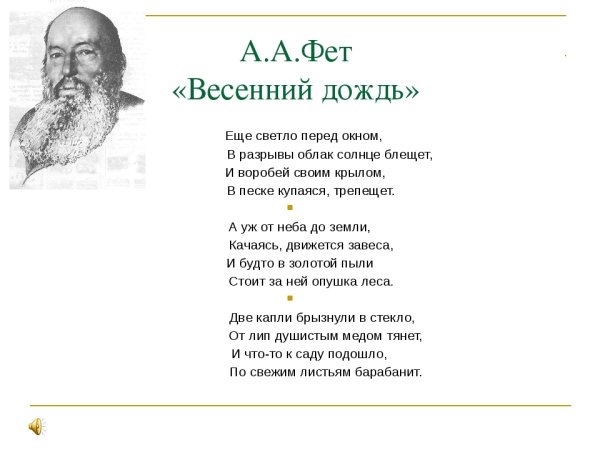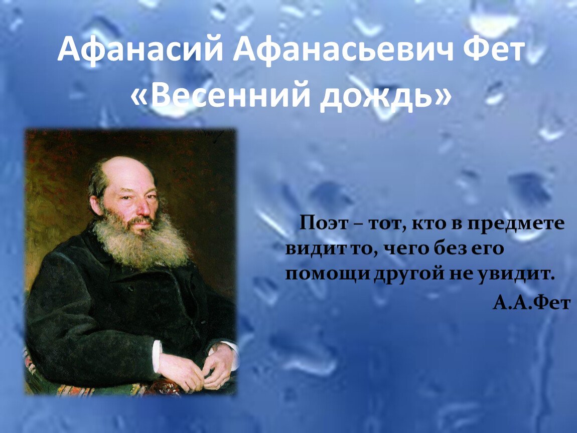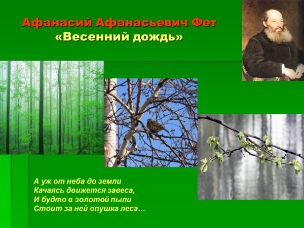 Великий русский поэт Афанасий Афанасьевич Фет в своем произведении "Весенний дождь" передает неповторимую атмосферу расцветающей природы и переживаний человека. Иллюстрация к этому стихотворению столь же проникновенна и выразительна, как сам текст. Она отражает игру света и тени, мягкость и плавность линий, создавая образ весеннего дождя, который оживляет природу и наполняет сердца эмоциями. Каждая деталь и цветовая гамма иллюстрации создают впечатление настоящего погружения в мир поэзии Фета, позволяя читателю еще глубже вникнуть в смысл и красоту его стихов. Эта иллюстрация является не только украшением книги, но и отдельным произведением искусства, способным передать всю глубину и изящество философии Афанасия Фета.