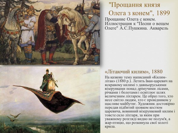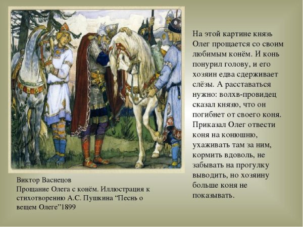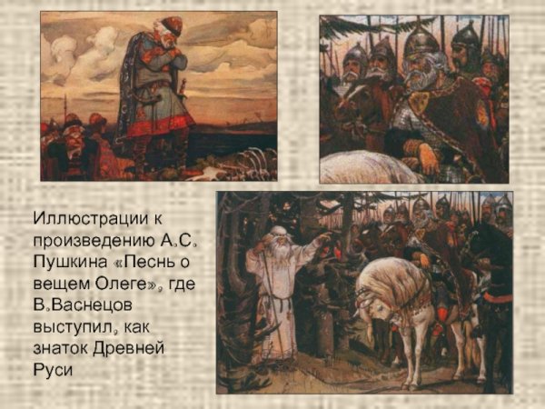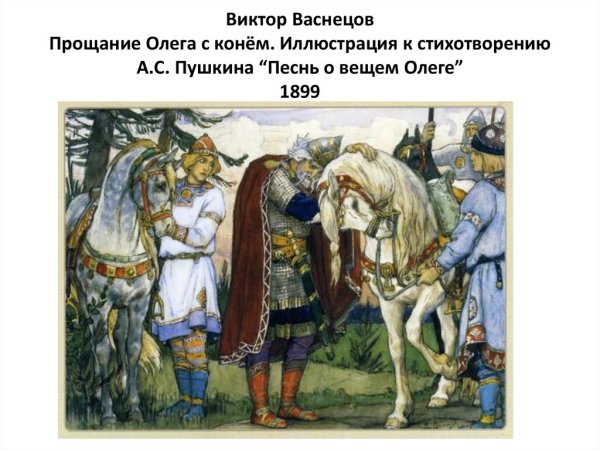 Иллюстрации Васнецова к эпической поэме "Песнь о вещем Олеге" являются истинным произведением искусства. Эти уникальные художественные работы полностью передают героизм и мощь этого древнерусского правителя. Васнецов сумел воссоздать атмосферу того времени, воплощая на своих полотнах битвы, сражения и величие Олега. Каждая деталь иллюстраций проработана до мельчайших нюансов, отражая настроение и силу персонажей. Они являются не только визуальным представлением о поэме, но и подчеркивают ее глубокий символизм и историческую значимость. Иллюстрации Васнецова к "Песни о вещем Олеге" безусловно заслуживают признания как шедевры русского живописного искусства.