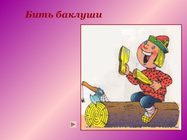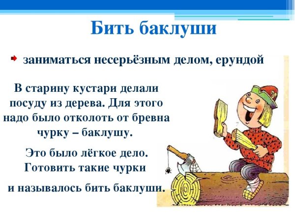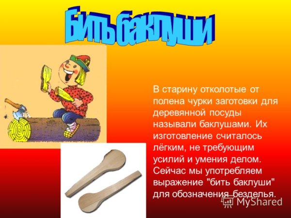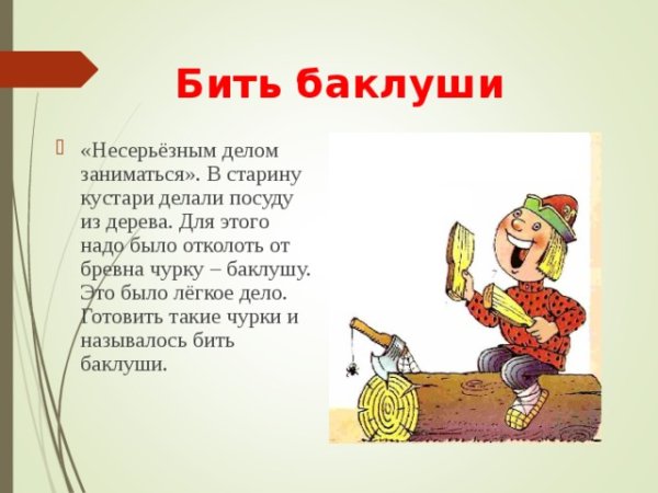 "Бить баклуши" – это фразеологизм, который описывает действие человека, уходящего, избегающего ответственности или обязательств. Этот выражение имеет несколько теорий происхождения, но все они связаны с игрой в кегли. Согласно одной из версий, "бить баклуши" означает уклоняться от игры, когда кегли разбиваются по краям а не по центру. Таким образом, этот фразеологизм стал символом уклонения и избегания обязательств. В повседневной речи он используется для описания ситуаций, когда кто-то избегает чего-то, не желая принимать активное участие или нести ответственность.