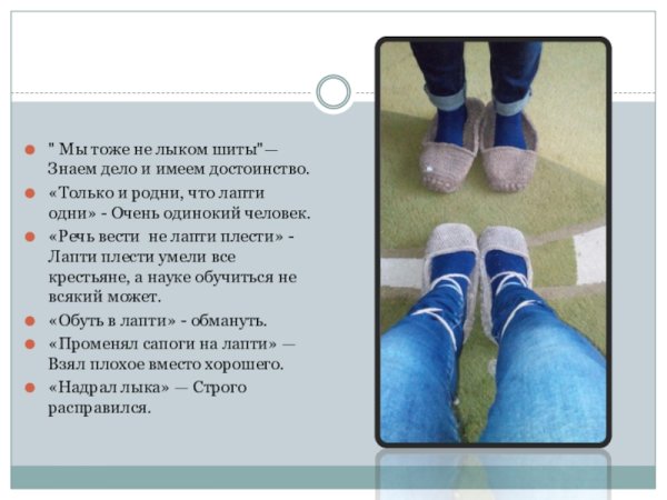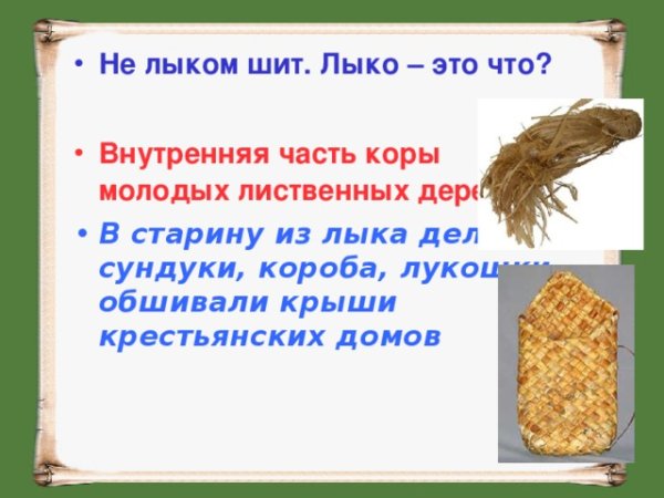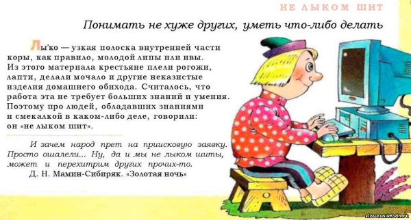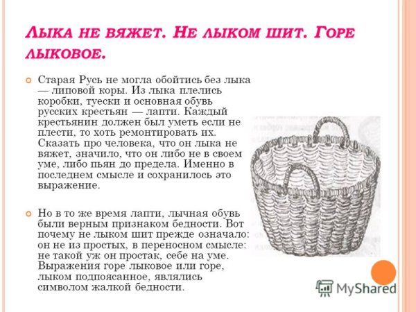 Фразеологизм "не лыком шит" является выражением, которое описывает человека, неспособного выполнить какую-либо задачу или действие. Иллюстрация к этому выражению может быть представлена в виде ситуации, где человек пытается прошить лыко иголкой, но безуспешно - нить разрывается, стежки получаются кривыми и неровными. Этот образ наглядно демонстрирует, что человек не обладает навыками или умениями для успешного выполнения задачи, а его попытки оканчиваются неудачей. Такая иллюстрация поможет передать смысл фразеологизма "не лыком шит" и подчеркнуть его отрицательную коннотацию.