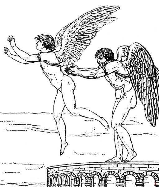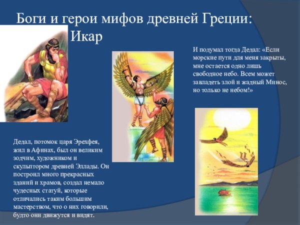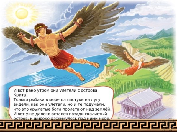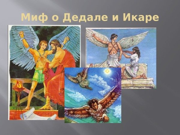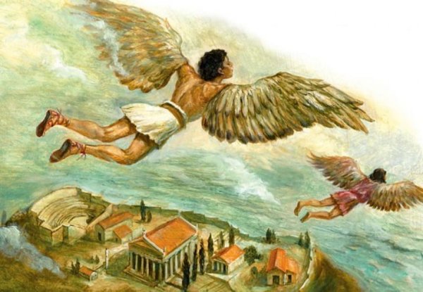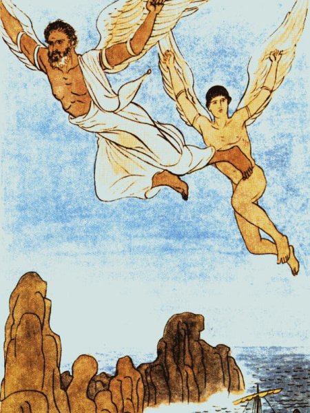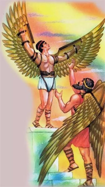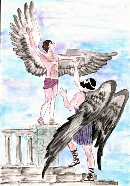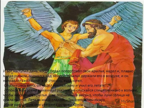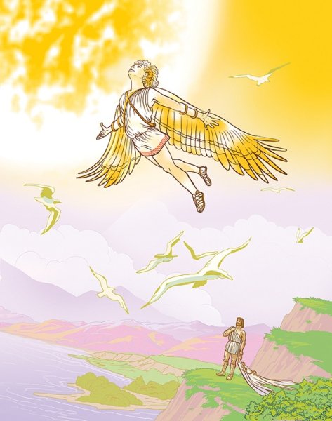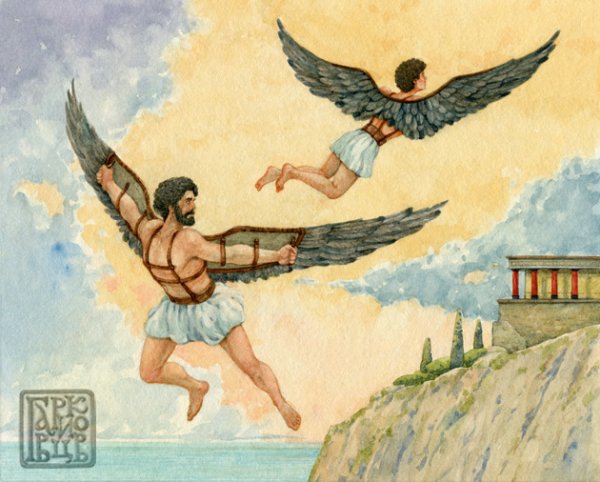 Иллюстрация о мифе Дедале и Икаре - это потрясающий способ визуализации этой знаменитой греческой легенды. Великий архитектор Дедал основал свою репутацию на создании сложных лабиринтов и уникальных инженерных решений. Вместе с сыном Икаром, они были заключены в лабиринте Критским царем Миносом. Но Дедал придумал план побега - он создал крылья из перьев и воска для себя и Икара. Он предупредил сына не лететь слишком близко к солнцу, но Икар, очарованный свободой полета, не смог устоять и поднялся выше дозволенного. В конечном итоге, под сильными лучами солнца, воск растаял и Икар погиб. Эта иллюстрация наглядно передает трагическую историю о гордыне и последствиях превышения границ, а также демонстрирует мастерство Дедала и его желание обрести свободу.