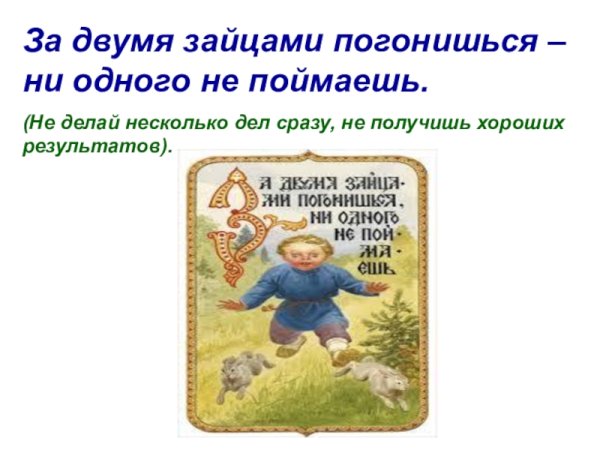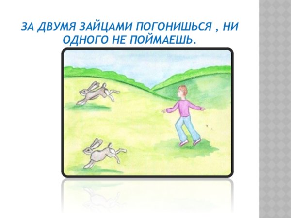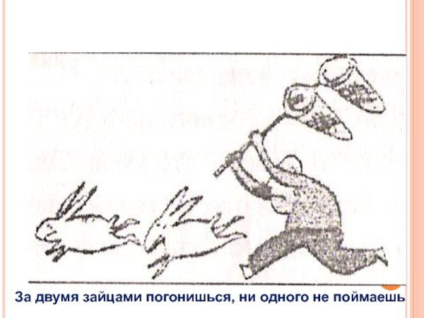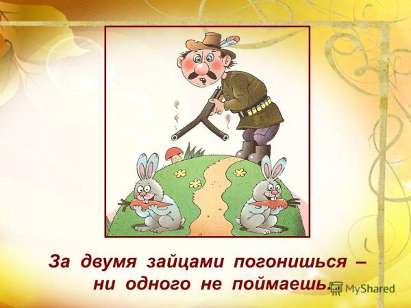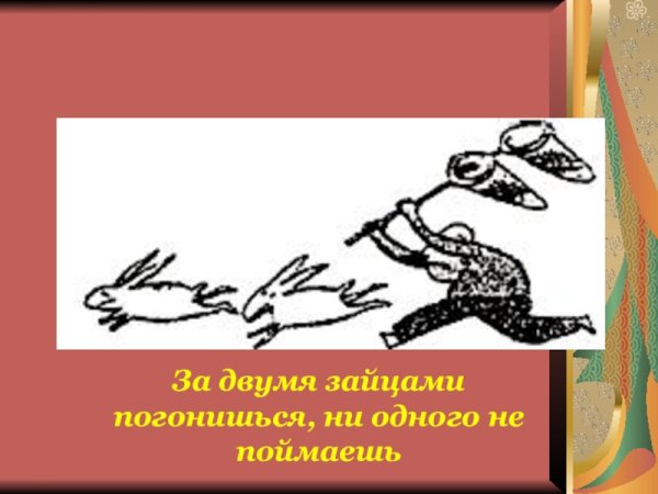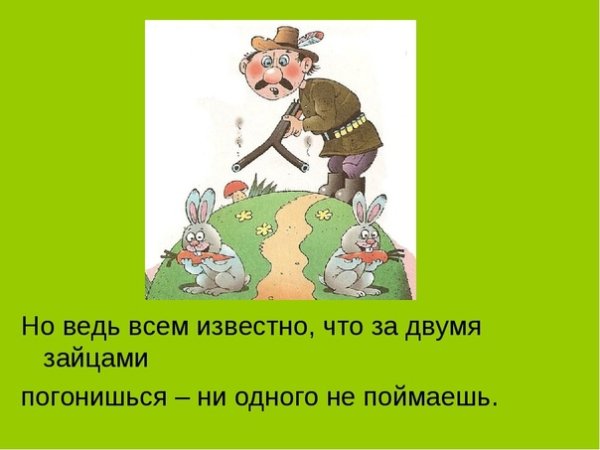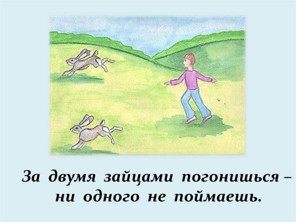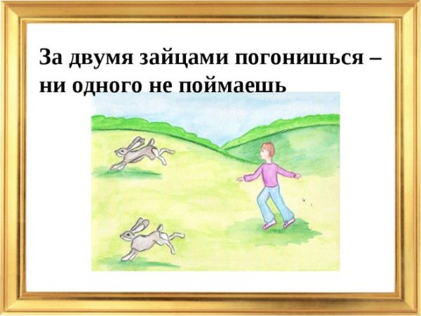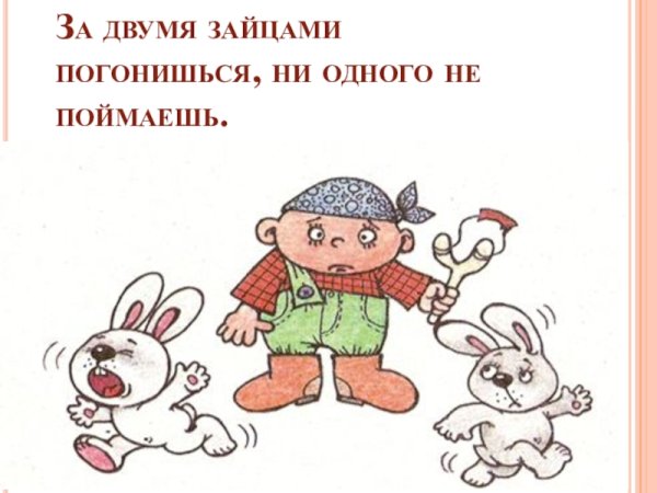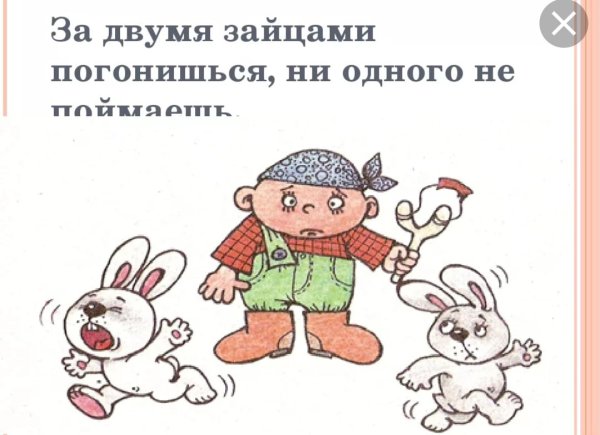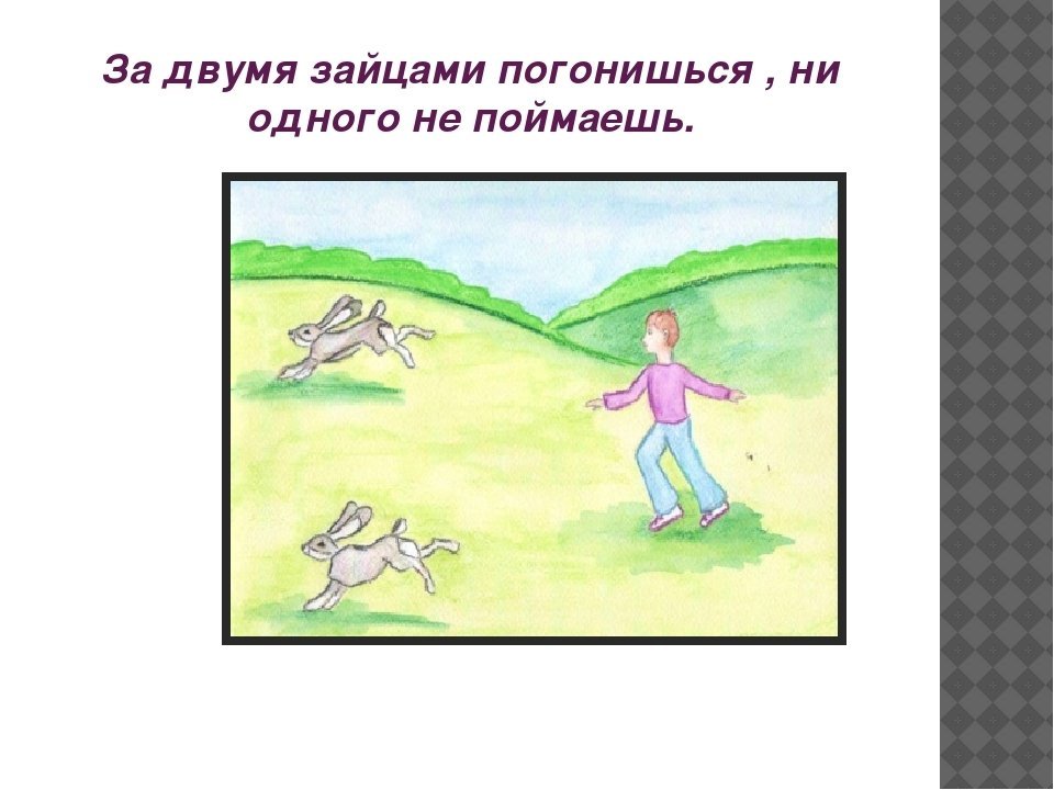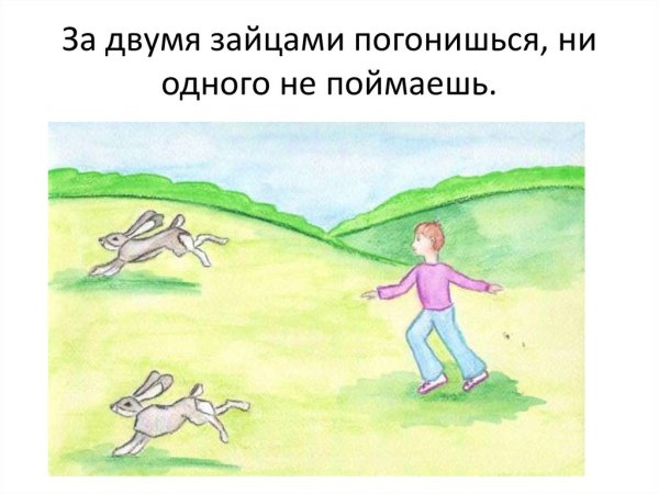 За двумя зайцами погонишься, ни одного не поймаешь - это известное выражение, которое в переносном смысле означает, что если слишком много рассредоточить свои усилия и внимание на разных задачах или целях, то есть вероятность не достичь ни одной из них. Это применимо в различных сферах жизни, будь то бизнес, работа или личные отношения. Ведь когда мы разбрасываемся на разные задачи, без должной концентрации и фокуса, мы рискуем потерять возможность успешно завершить хотя бы одну из них. Поэтому важно определить главную цель или приоритет и сосредоточить свои усилия на достижении именно этого результата.