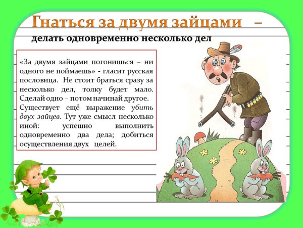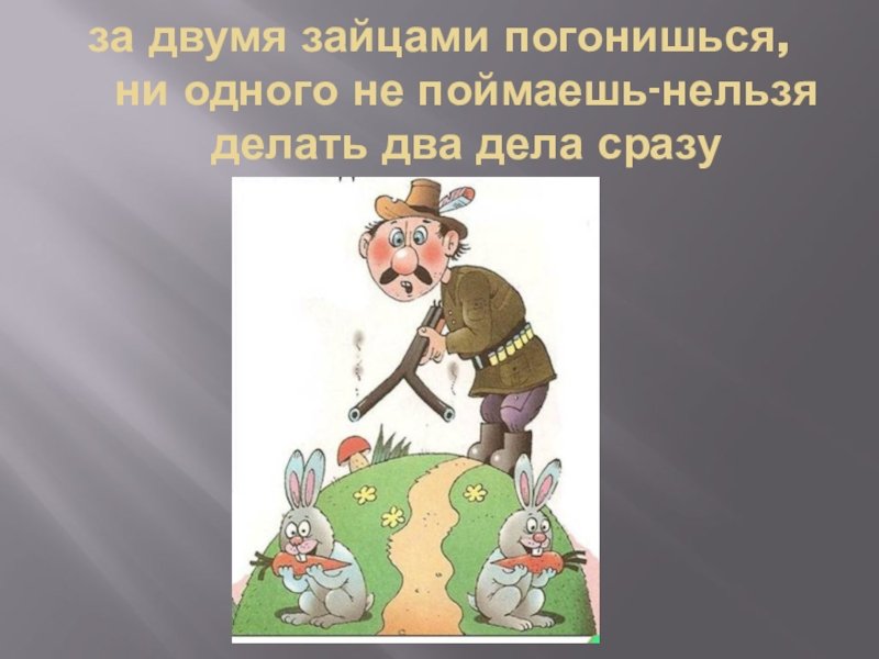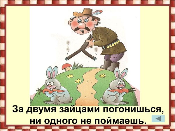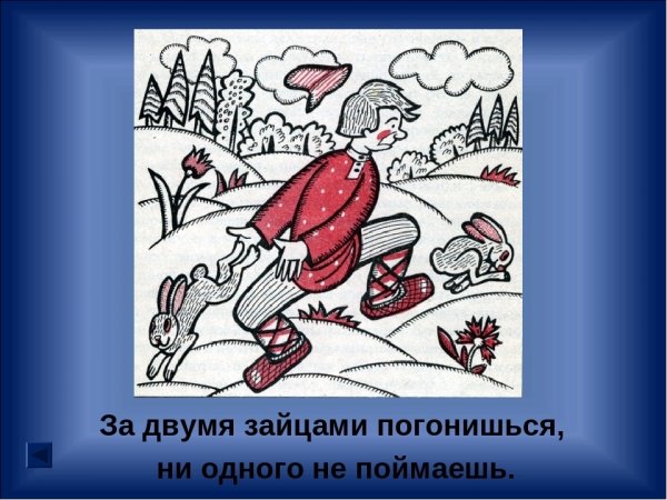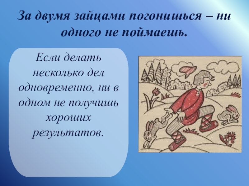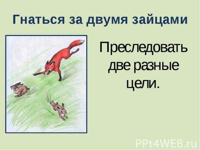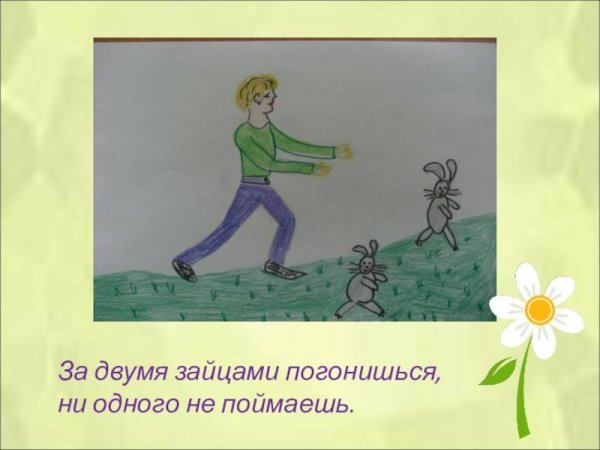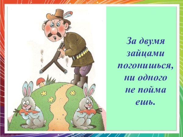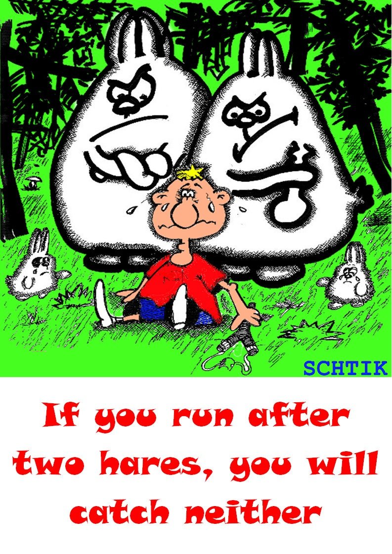 За двумя зайцами погонишься, ни одного не поймаешь - это известное выражение, которое в переносном смысле означает, что если слишком много рассредоточить свои усилия и внимание на разных задачах или целях, то есть вероятность не достичь ни одной из них. Это применимо в различных сферах жизни, будь то бизнес, работа или личные отношения. Ведь когда мы разбрасываемся на разные задачи, без должной концентрации и фокуса, мы рискуем потерять возможность успешно завершить хотя бы одну из них. Поэтому важно определить главную цель или приоритет и сосредоточить свои усилия на достижении именно этого результата.