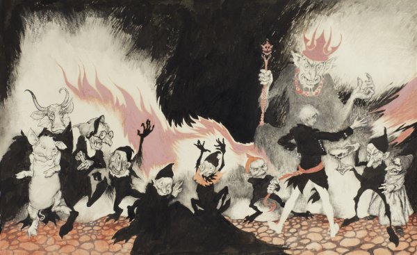 Иллюстрация в пещере горного короля - это захватывающая и потрясающая сцена, которая переносит зрителя в мир загадочных подземных лабиринтов и величественных пещер. В этой иллюстрации можно увидеть великолепные сталактиты и сталагмиты, которые обрамляют каменную тронную платформу, на которой расположен сам горный король. Его могущественный облик и присутствие создают атмосферу тайны и мистики. Освещение в пещере, играющее на стенах и предметах, добавляет глубину и реализм этой иллюстрации, делая ее по-настоящему захватывающей и незабываемой. Это произведение искусства оживляет фантазию зрителя, позволяя ему окунуться в удивительный мир таинственности и волшебства.